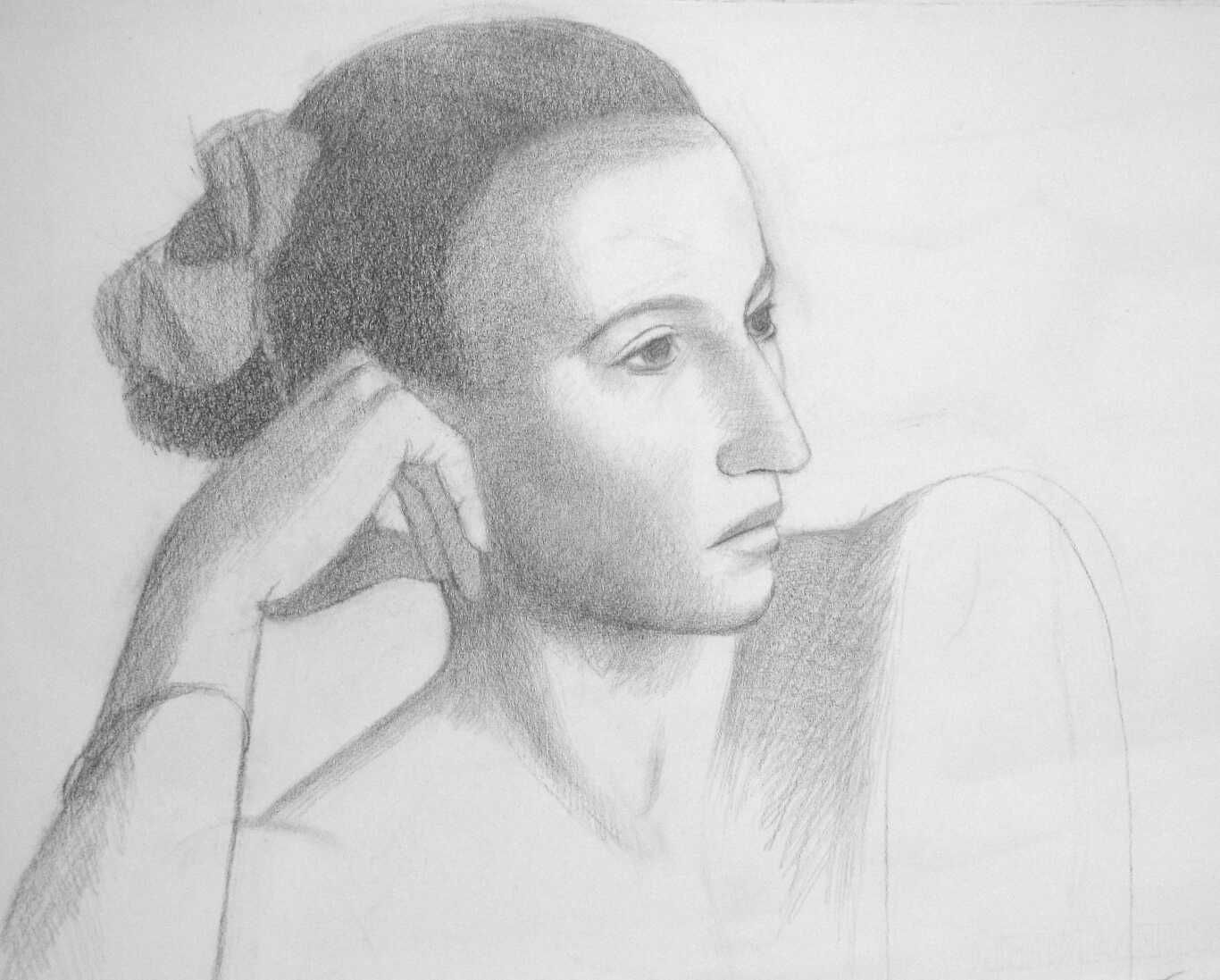 Drawing of woman from chest up. Woman rests head on left art and is looking towards the left. Woman has a bun, bow attached to hair, and is wearing a bracelet on left arm.Artwork Details