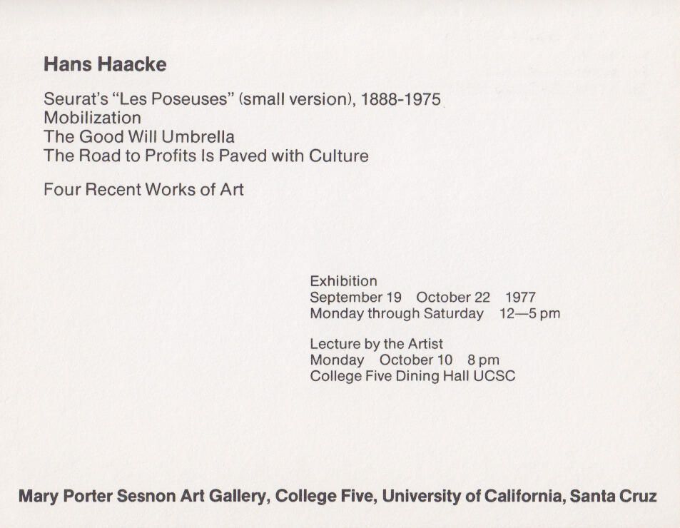 Four recent work by Hans Haacke with includes Seurat's "Les Poseuses", Mobilization, The Good Will Umbrella, and The Road to Profits Is Paved with Culture.