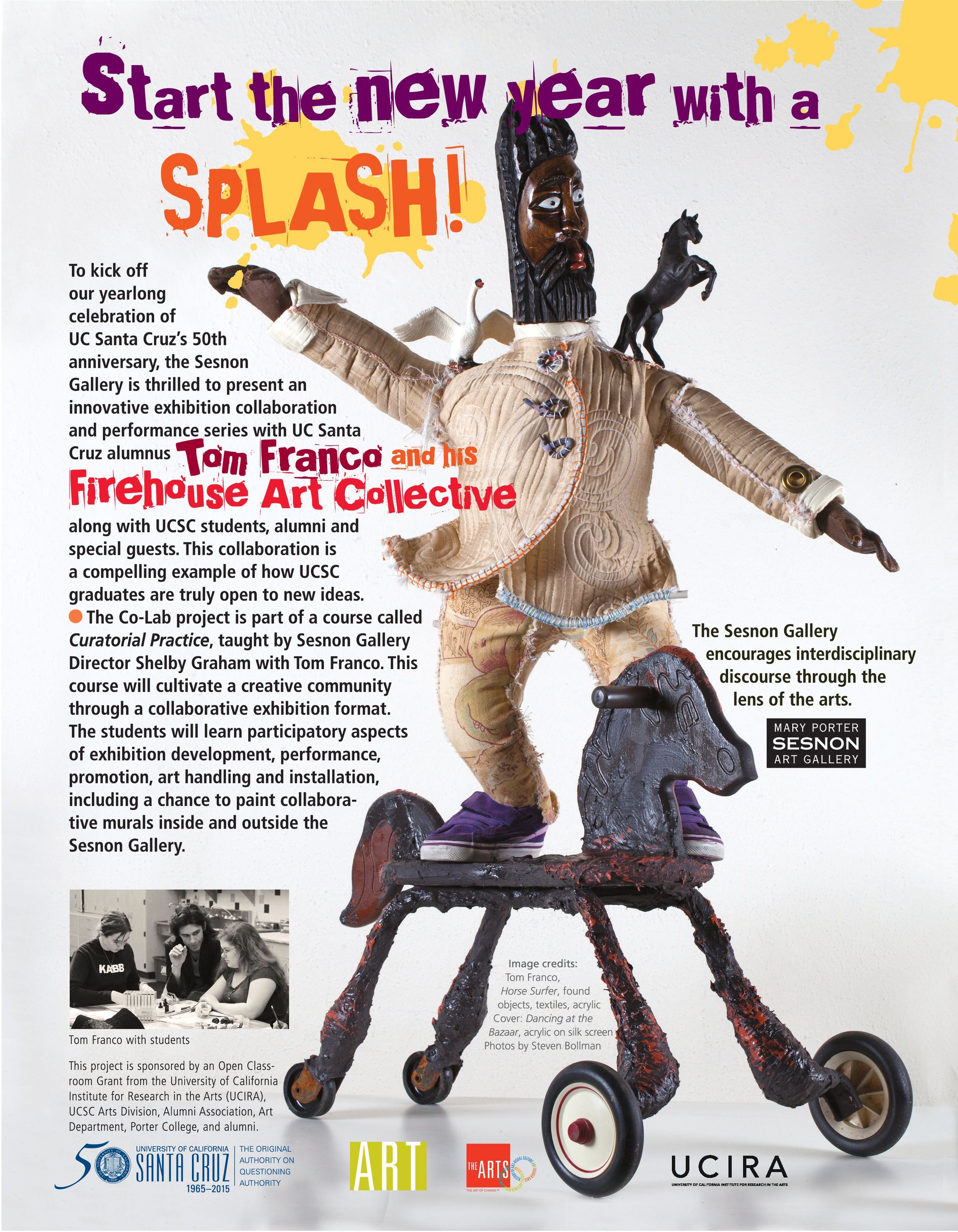 Tom Franco Co-Lab Exhibition. To kick off our yearlong celebration of UC Santa Cruz’s 50th anniversary, the Sesnon Gallery is thrilled to present an innovative exhibition collaboration and performance series with UC Santa Cruz alumnus Tom Franco and his Firehouse Art Collective, along with UC Santa Cruz students, alumni and special guests. This collaboration is a compelling example of how UC Santa Cruz graduates are truly original.