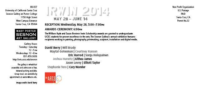 In text detailing the location and time of the exhibition. Includes information about the scholarship and the Sesnon Gallery.