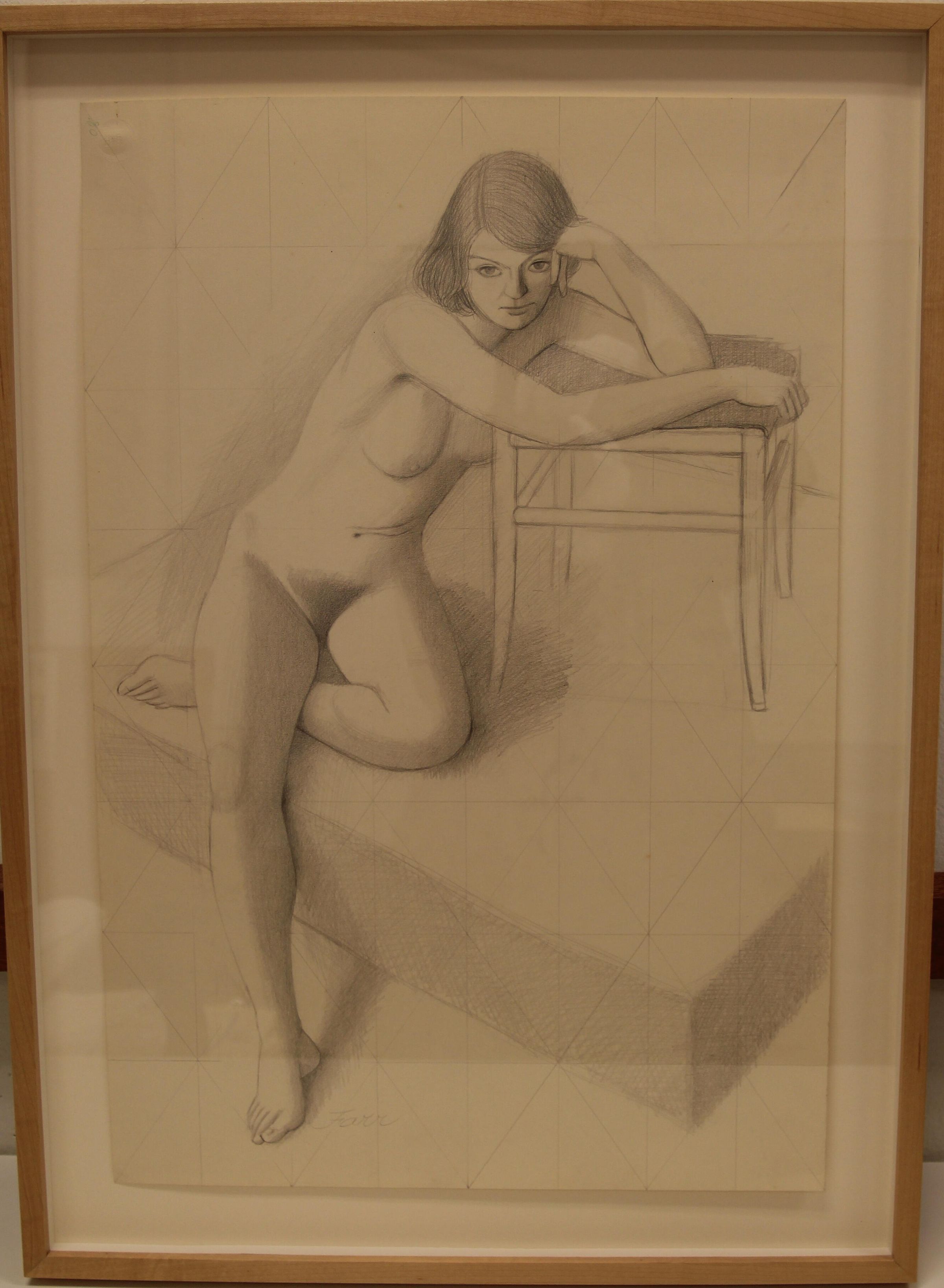 A nude woman reclines on a small table, staring at the viewer. She sits on one leg.Collection