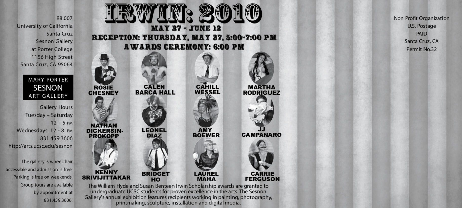 The back of the 2010 Irwin Scholar postcard. Irwin Scholars include Rosie Chesney, Calen Barca Hall, Cahill Wessel, Martha Rodriguez, Nathan Dickersinprokopp, Leonel Diaz, Amy Boewer, JJ Campanaro, Kenny Srivijittakar, Bridget Ho, Laurel Maha, Carrie Ferguson.