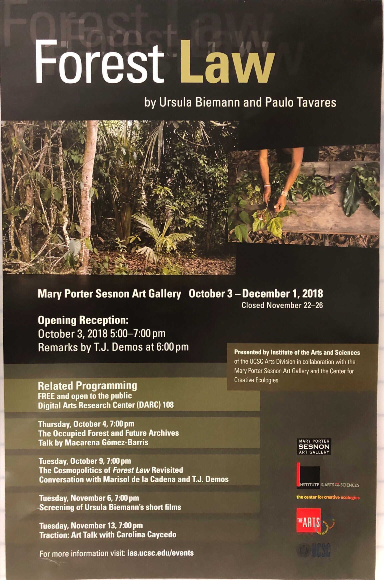 The Institute of the Arts and Sciences, in collaboration with the Mary Porter Sesnon Art Gallery and the Center for Creative Ecologies presents Forest Law, an exhibition by artist-researcher Ursula Biemann and architect Paulo Tavares. From October 3 - December 1, 2018