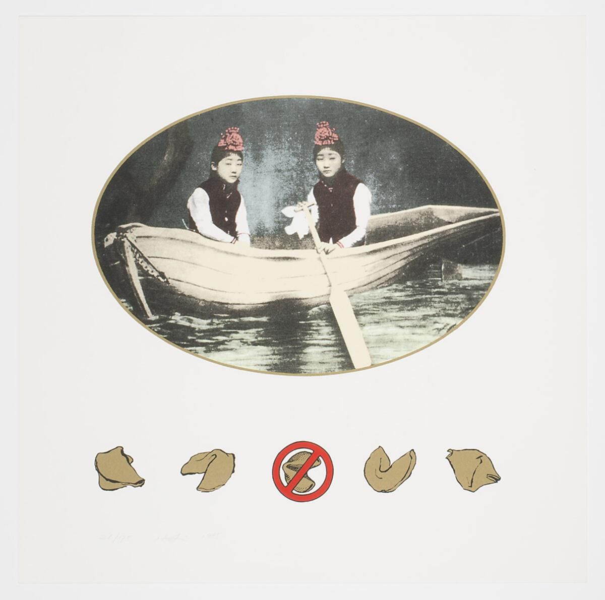 Two girls look forlorn at the viewer. One holds a paddle. Both wear red adornments. Five fortune cookies line the bottom of the page.Type of Print