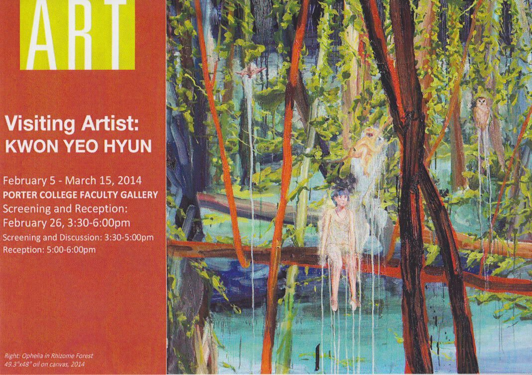 Visiting Artist Kwon Yeo Hyun from Kookmin University in Seoul is UC Santa Cruz Art Department's Artist-in-Residence 2013-2014. His work will be on exhibition in the Porter Faculty Gallery February 5-March 15, 2014. Kwon Yeo Hyun is a professor of art at the Kookmin University in Seoul, Korea where he is teaching painting and installation. Professor Kwon has an MFA from Seoul National University and is highly acclaimed Korean artist whose work has been exhibited internationally in 32 solo exhibitions and more than 350 group exhibitions. He works in a great variety of formats, including painting, drawings, photography, film, installation, and preformance.