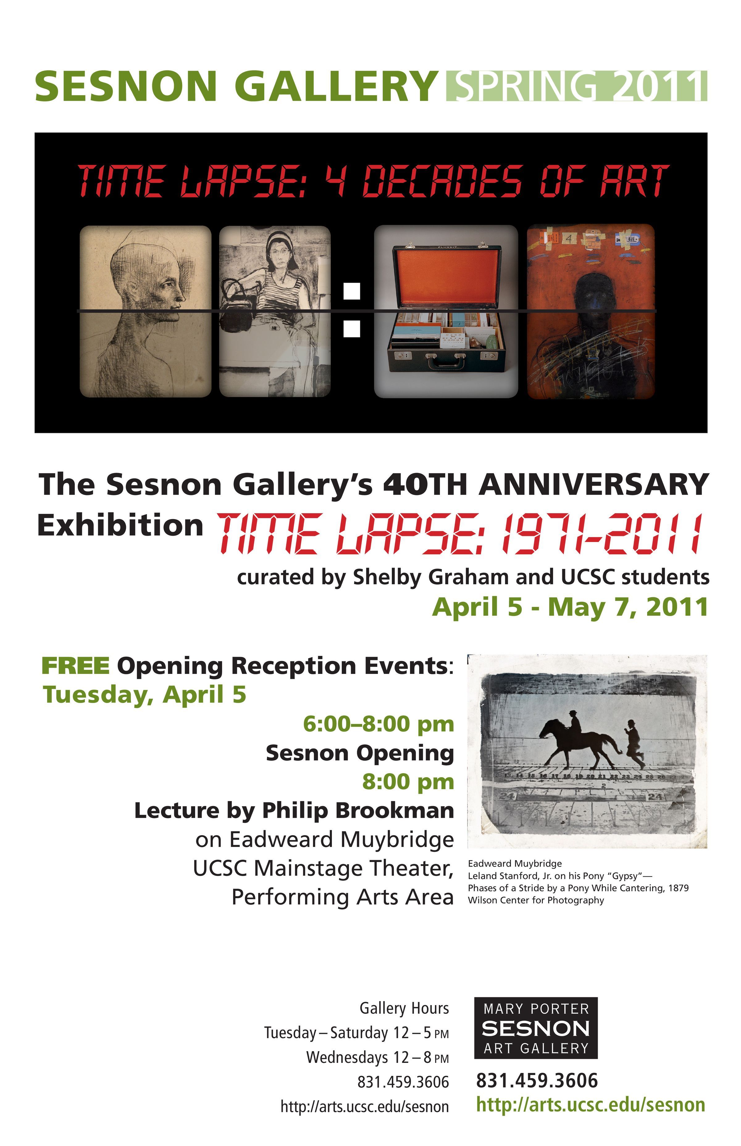Time Lapse Sesnon Gallery's 40th Anniversary. The Sesnon Gallery celebrates its 40th Anniversary in 2011 featuring a legacy of programming and exhibitions with provocative selections from the past four decades with curators/directors: Philip Brookman, Rolando Castellon, Andrea Hesse, Bridget Barnes Pamela Bailey and Shelby Graham. Join us on a trip back in time, while helping us imagine and plan for a future art museum at UCSC.