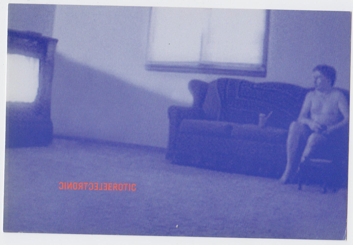 A photo of a man sitting on a couch watching a television monitor to his right. The photo is edited with the blue channel pushed. Orange text spelling CINORTCELEEROTIC.