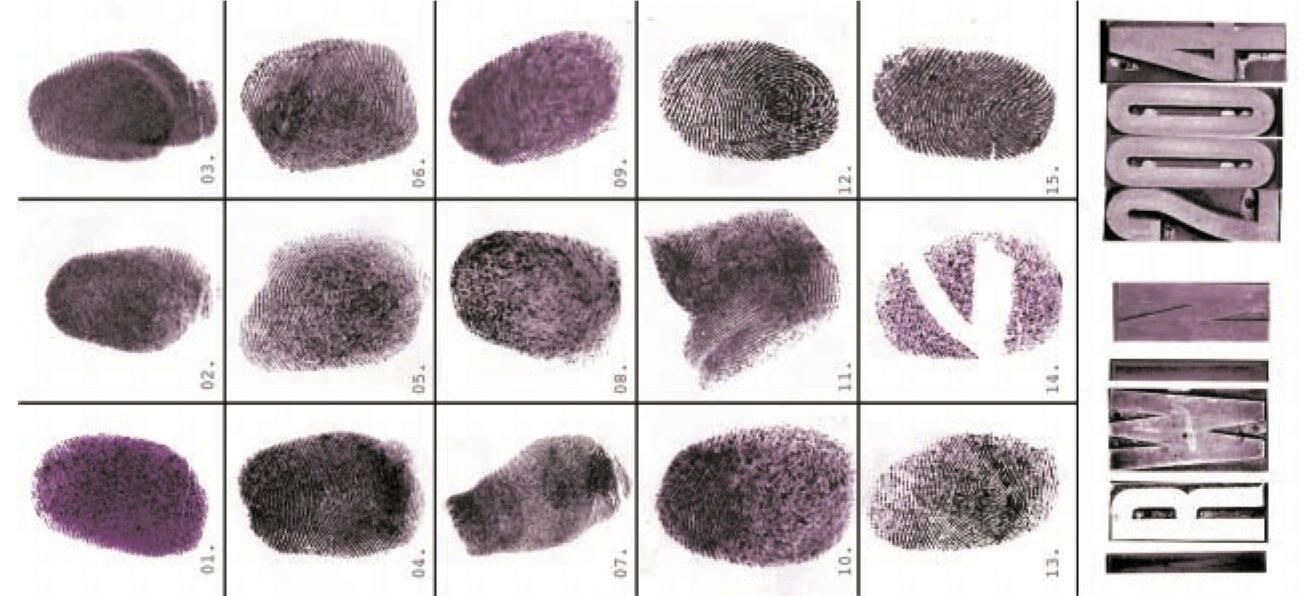 A 5x3 square grid of the scholars thumbprints. On the right in text we see IRWIN 2004 in a stamp style front.