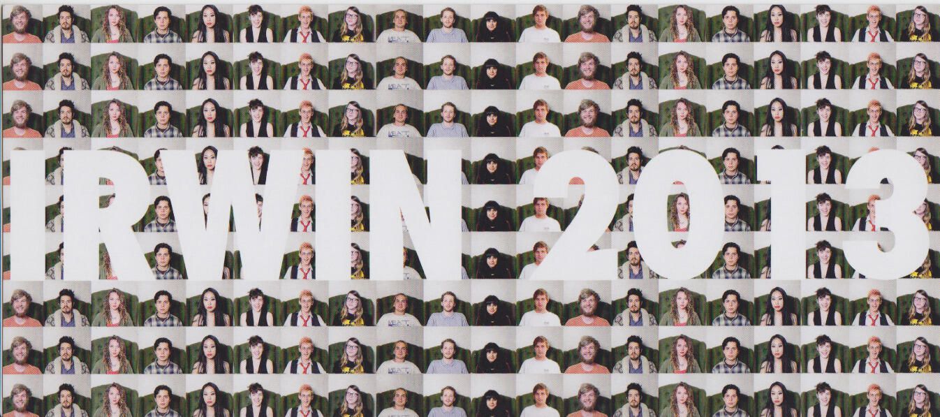 A grid of squares 20x9 containing the photographed portrait of the Irwin scholars from 2013. Over the photographed portrait in bold white text "IRWIN 2013".