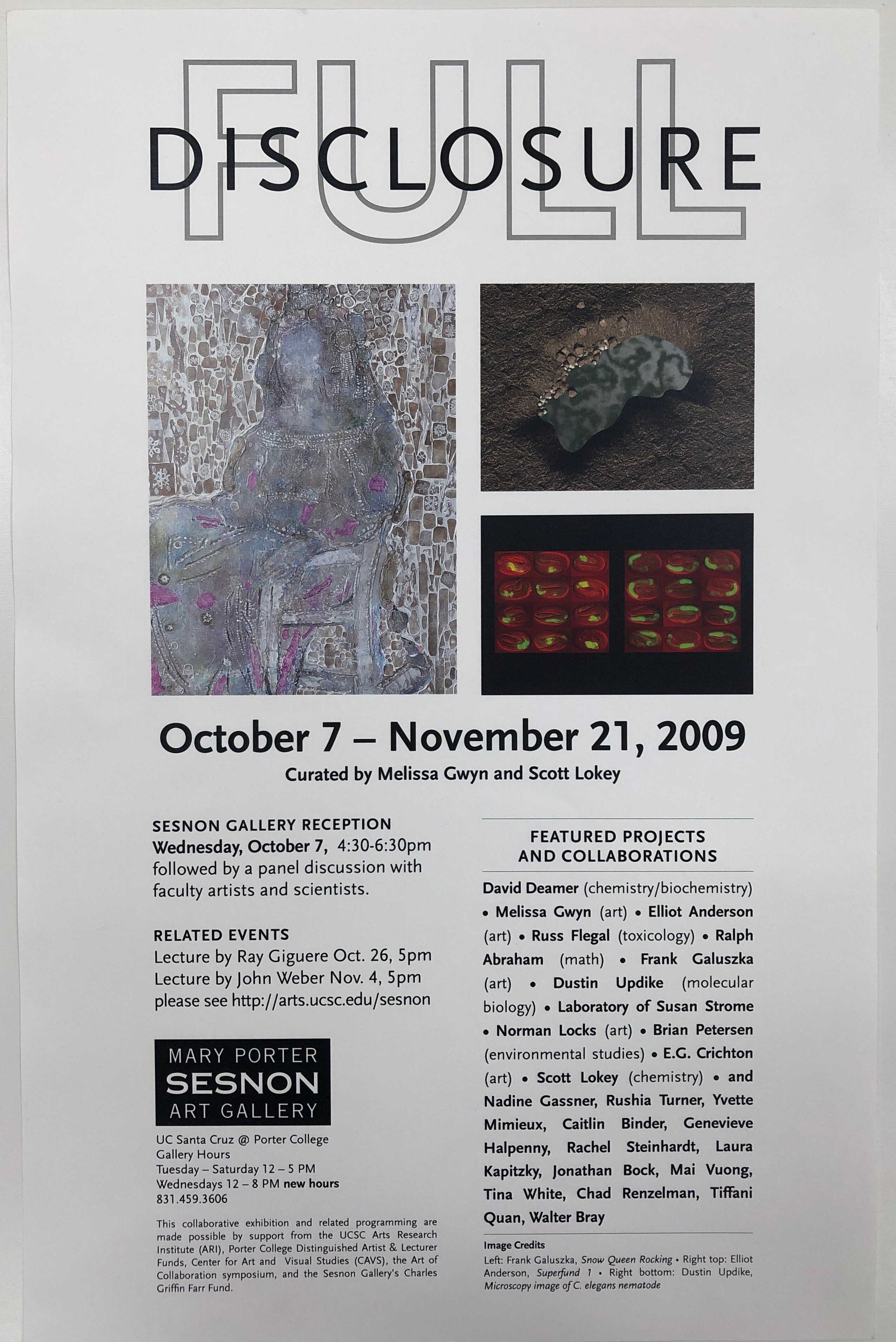 Full Disclosure is an inside look at the trial and error of scientists and artists through an intimate survey of their processes. Curated by Melissa Gwyn and Scott Lokey.