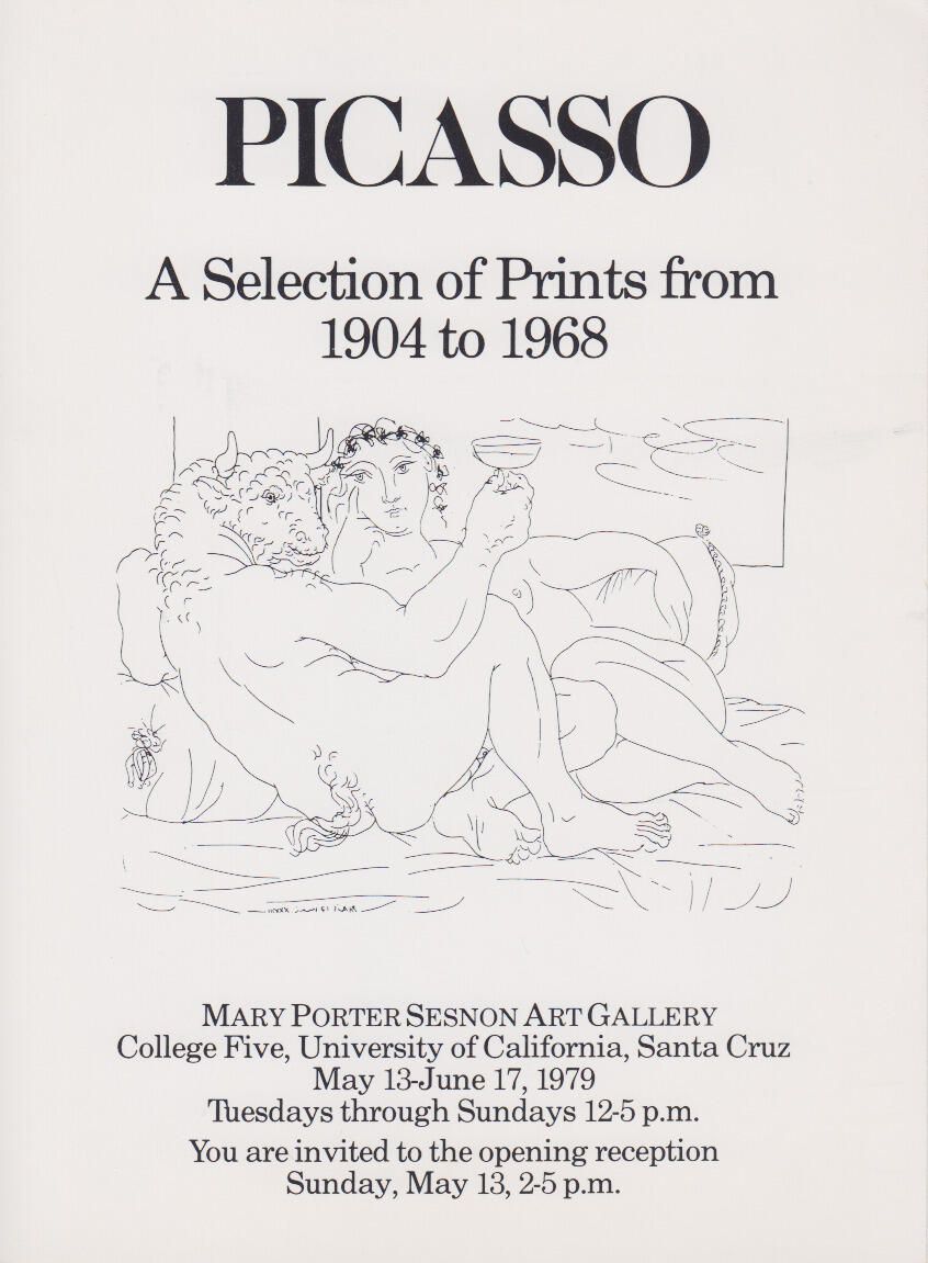 Name of the Exhibition in the top middle of the postcard. Underneath is a drawing of naked person laying next to a person with a ram head and tail. Style of art follows the theme of greek and myth. Underneath the drawing is information about the gallery, date of exhibition, and time.