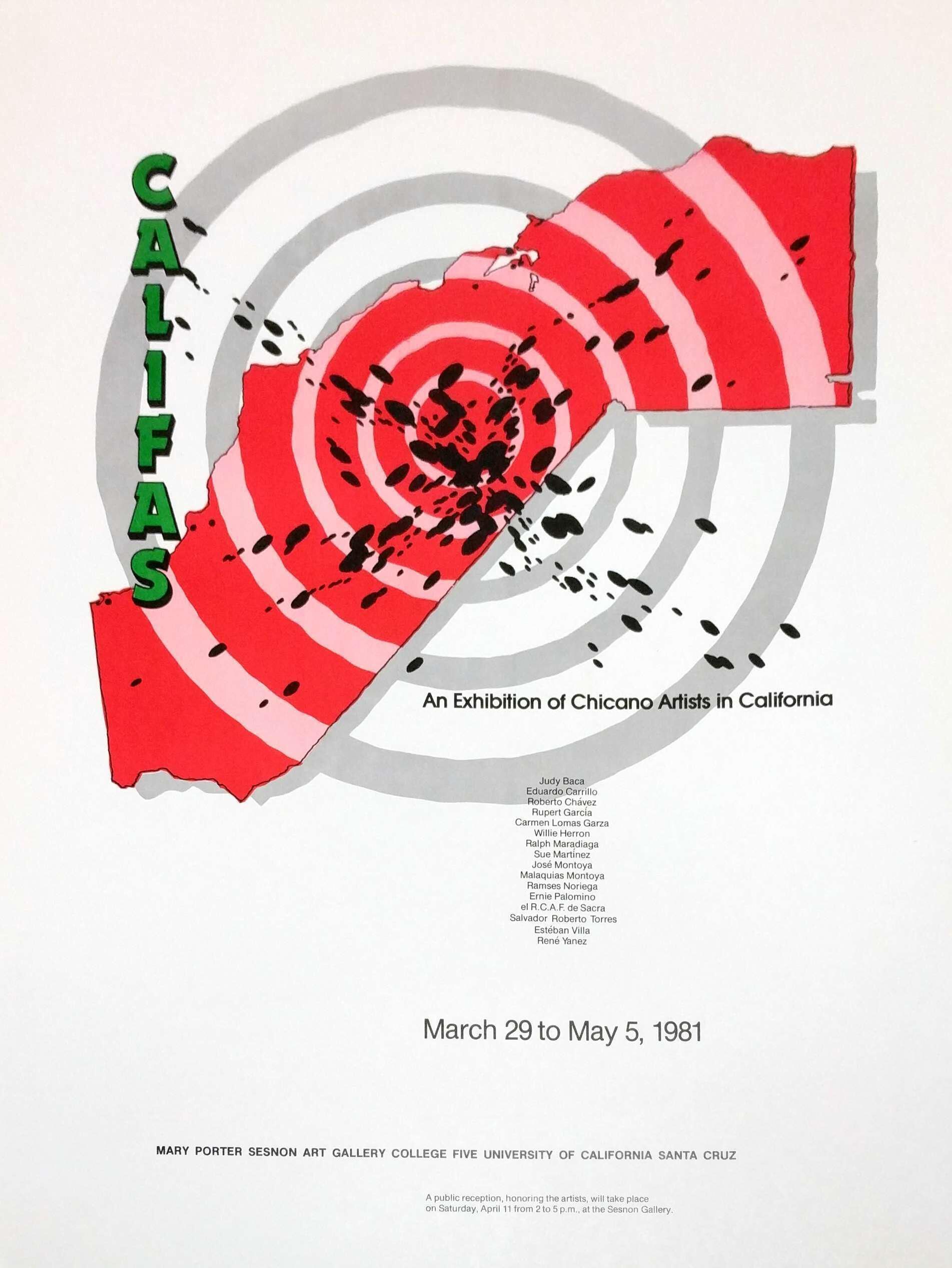 1981 Califas: An Exhibition of Chicano Artists in California. March 29 to May 5, 1981. Judy Baca, Eduardo Carrillo, Roberto Chavez, Rupert Garcia, Carmen Lomas Garza, Willie Herron, Ralph Maradiaga, Sue Martinez, Jose Montoya, Malaquias Montoya, Ramses Noriega, Ernie Palomino, el R.C.A.F. de Sacra, Salvador Roberto Torres, Esteban Villa, Rene Yanez