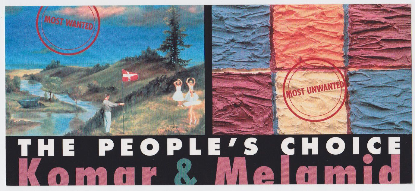 A painting of a man holding a Swiss flag next to ballerinas in a rolling landscape. A textured surface of different colored squares. On each image is a stamp with the words MOST WANTED. Underneath these images is the title of the exhibition and the artists' names.