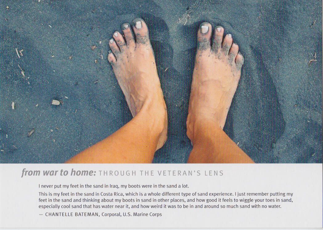 Bird eye shot of someones feet in the sand. Their toes are sandy and there are some woodchips in the sand.