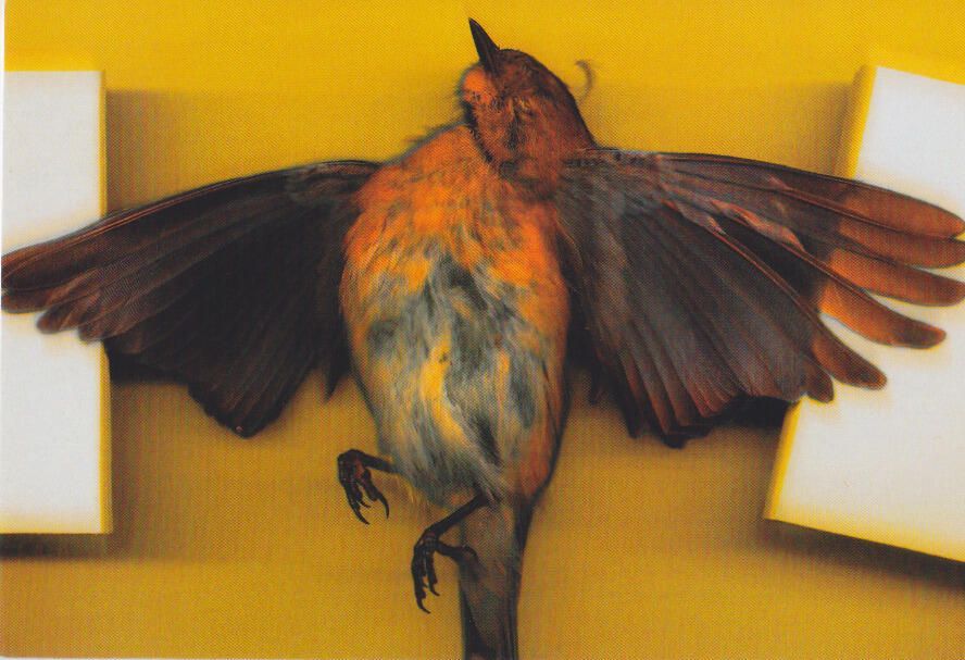 Picture of a bird that seems to be hurt. On a yellow background with a white square on both left and side of the wings.