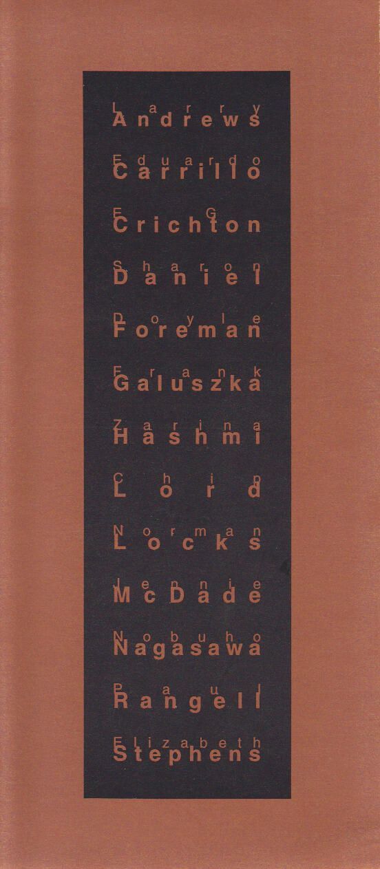 Burn orange/brown background. In the middle is a black square with all the names of the artists in color font.