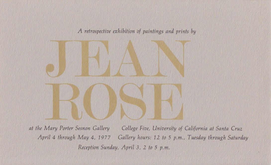 A retrospective exhibition of paintings and prints by Jean Rose.