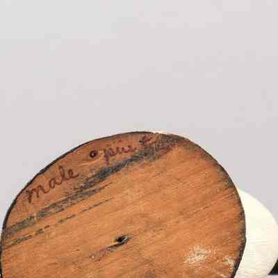 Gigi Hopkins: Part of a group of six with oval ink stamp (rare mark). Stamp not visible with "Male Pintail" written in brown ink on underside of base. Oval base. Eye is a circle of orange with round black center, standard Crowell feet. Paint not as complex as earlier oval stamp pintail, but nice.