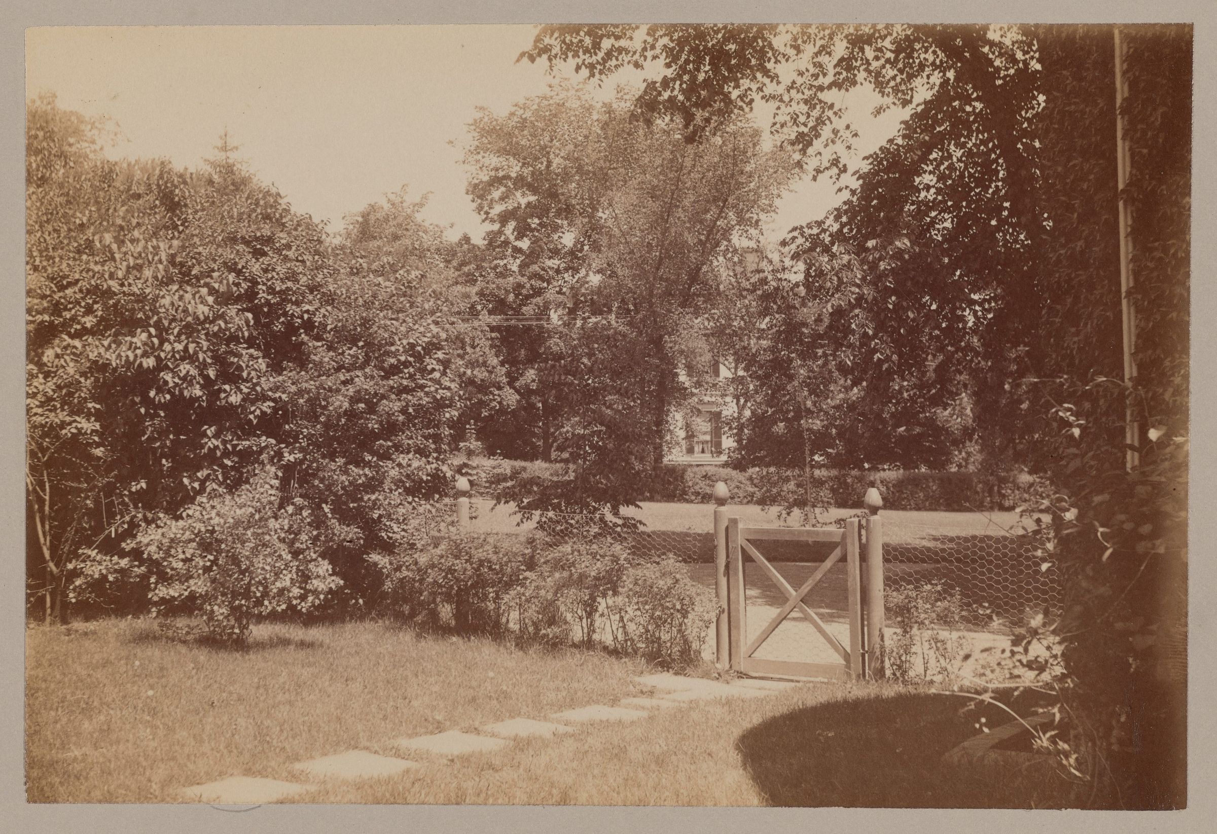 Grassy area with stone path leading to a garden gate and chicken wire fencing. White building visible through trees in the distance.Made/Created