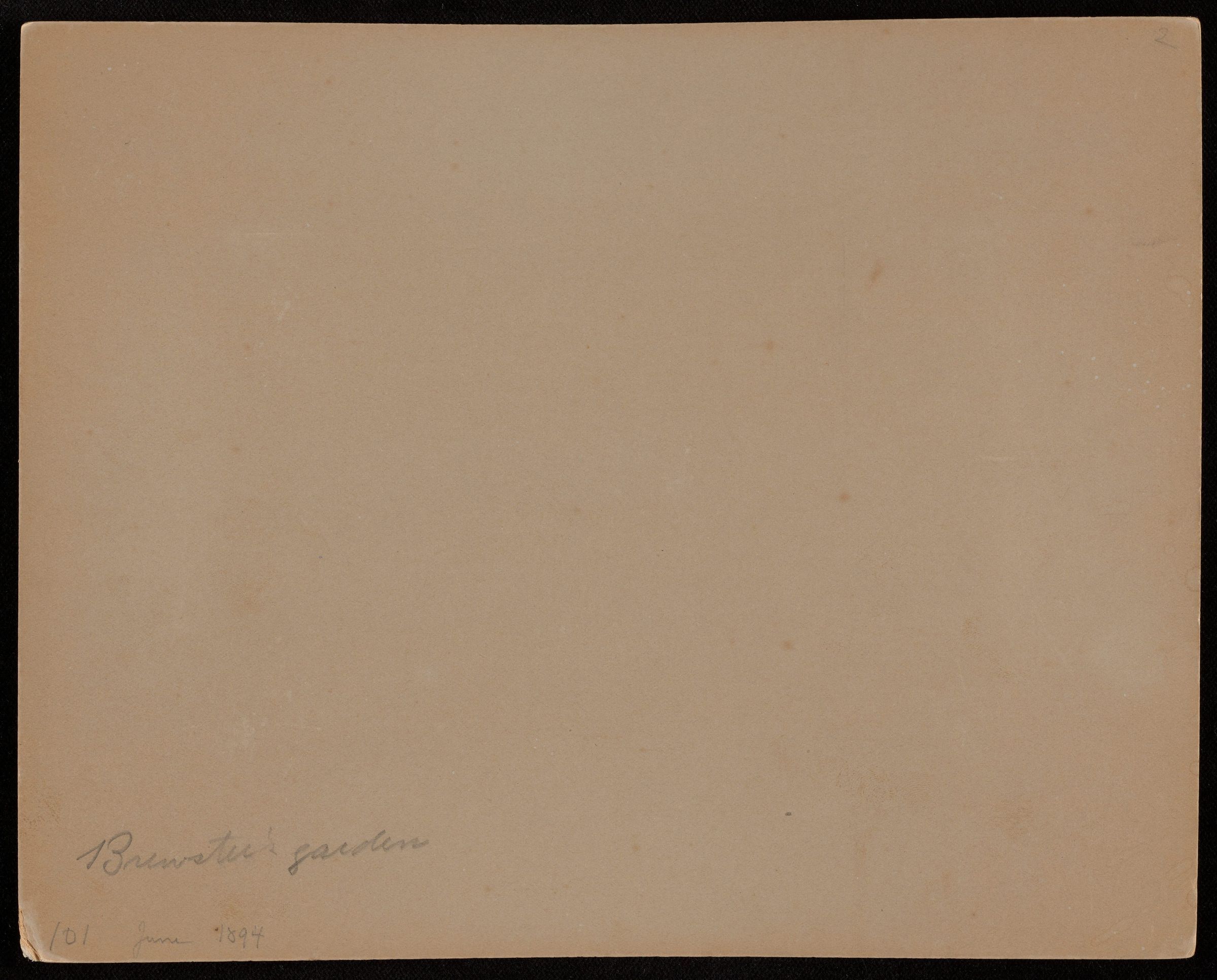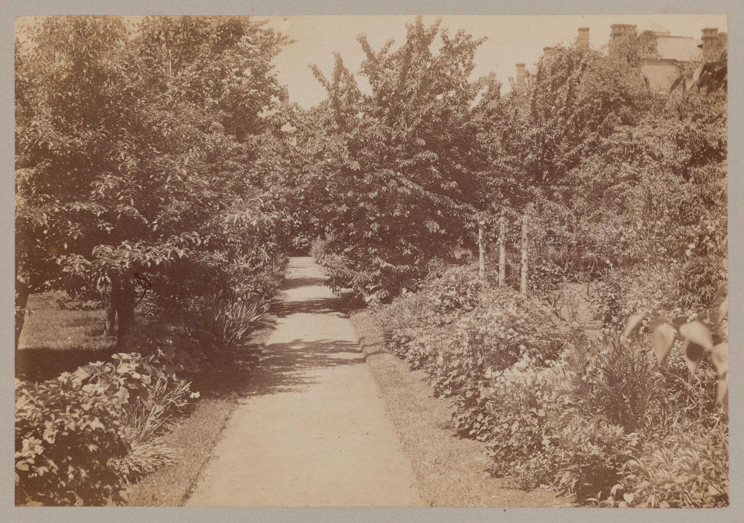 Garden pathway leading off in front of the viewer surrounded with vegetation and trees. Chimneys visible at top right.Made/Created