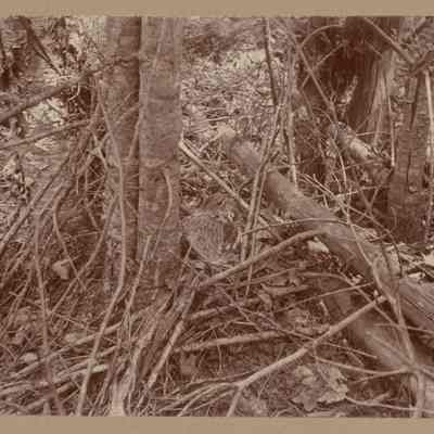 Bird on nest at center of image, tree trunks and brances present with leaves scattered on the ground.Made/Created