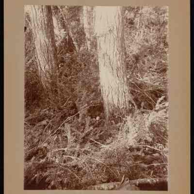 Nest with eggs just below center of image along base of tree trunk. Surrounded with branches and leaves.Made/Created