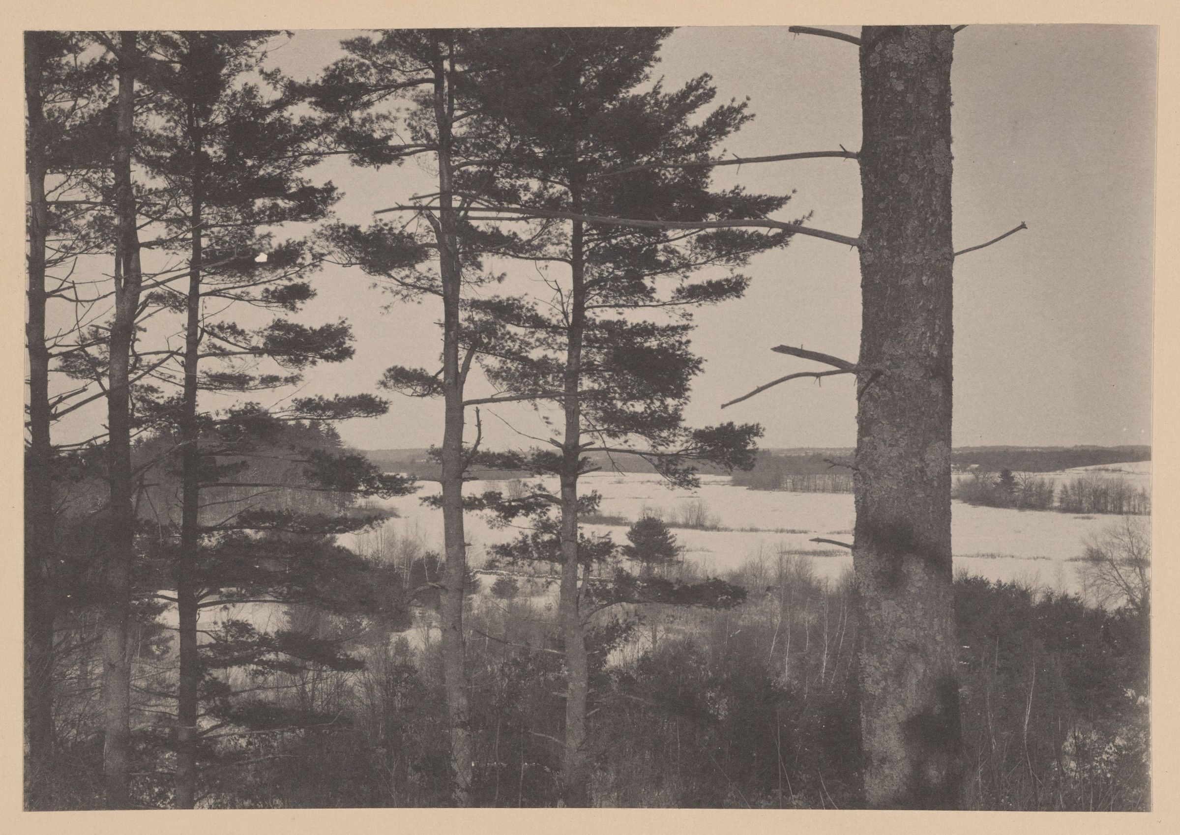 Open field visible through tall trees, trees visible in the distance at the horizon line.Made/Created