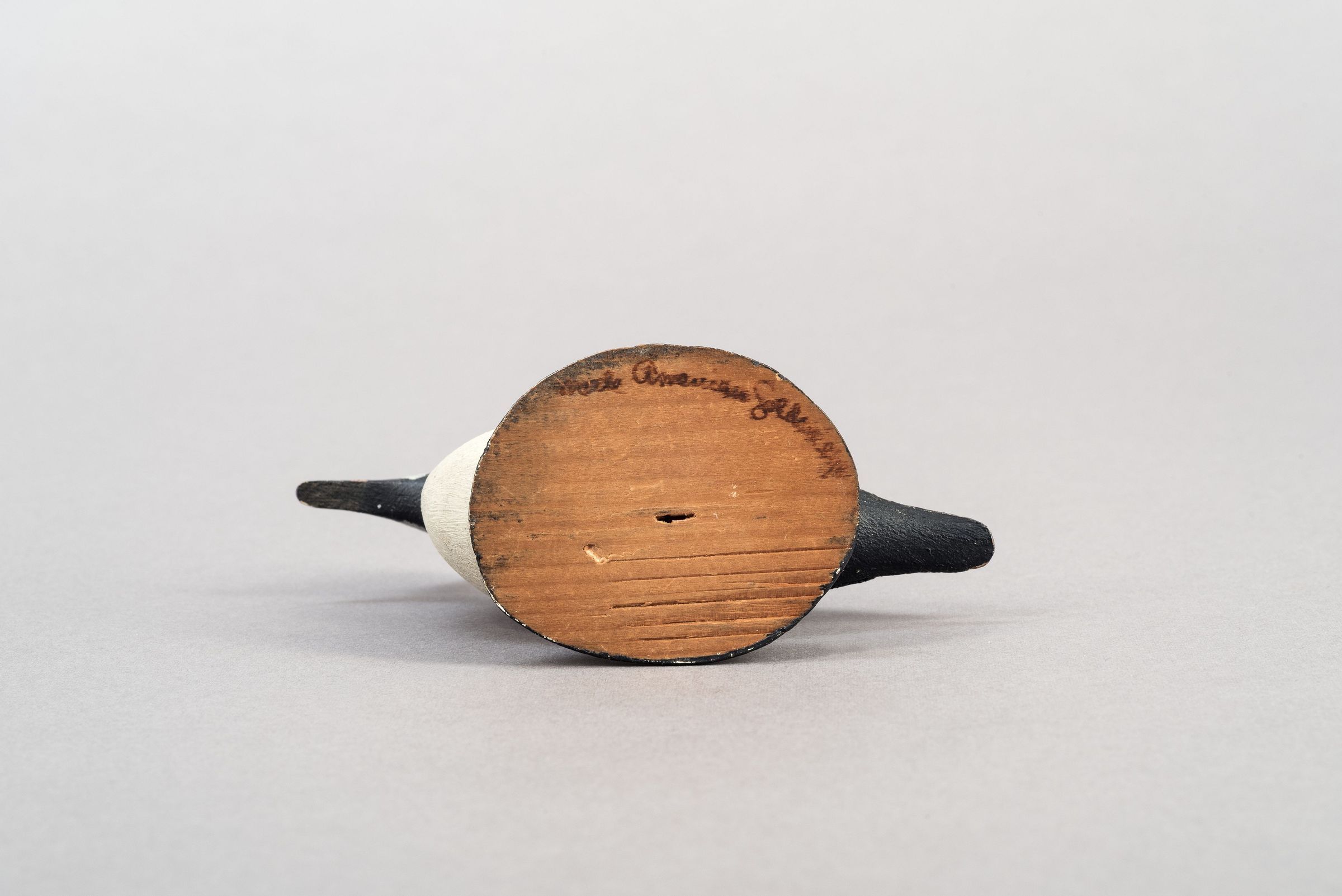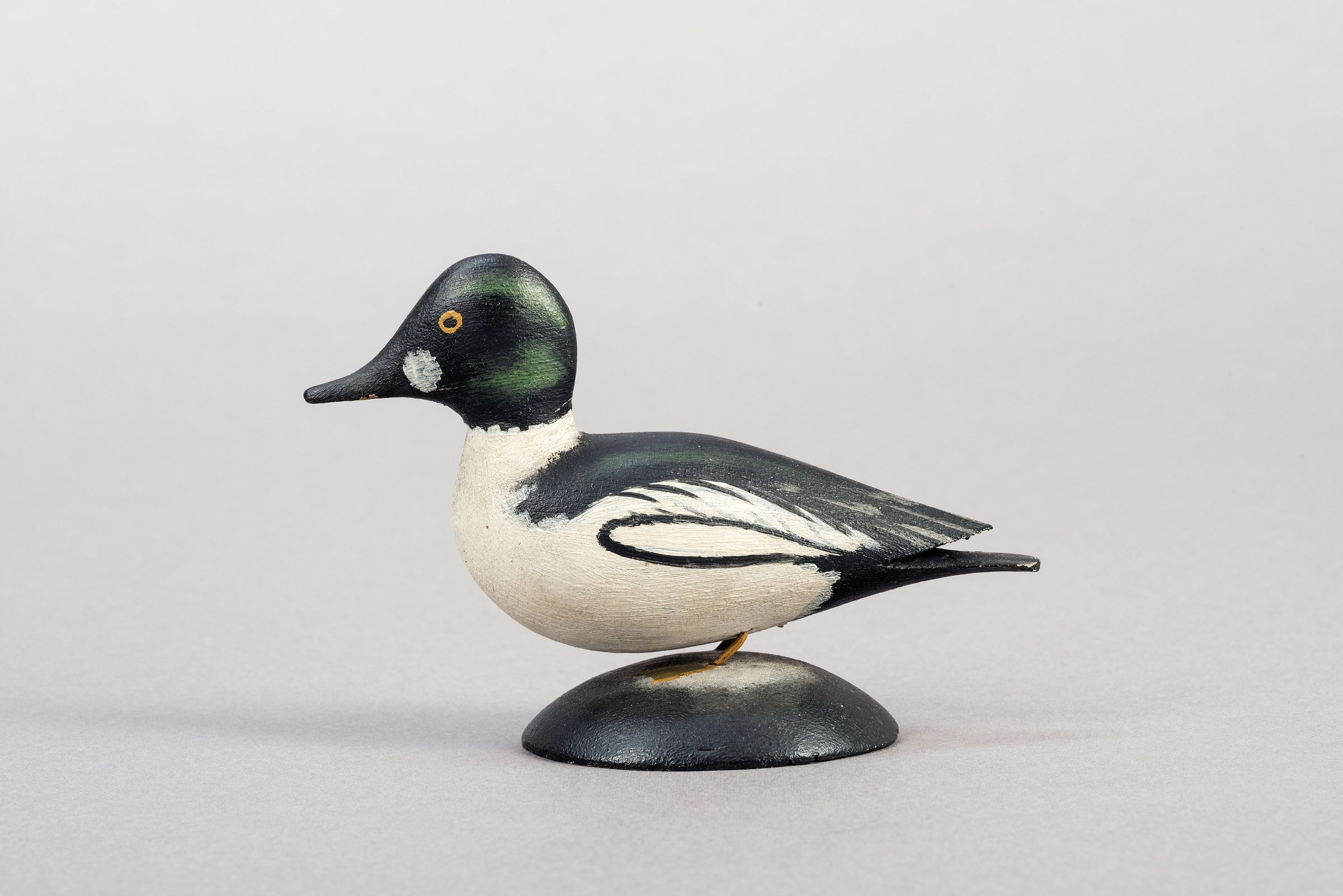 Gigi Hopkins: Part of a group of six with oval ink stamp (rare mark). Stamp not visible with "Male American Goldeneye" written in brown ink on underside of base. Oval base. Eye is a circle of orange with round black center, standard Crowell feet. Nice paint.