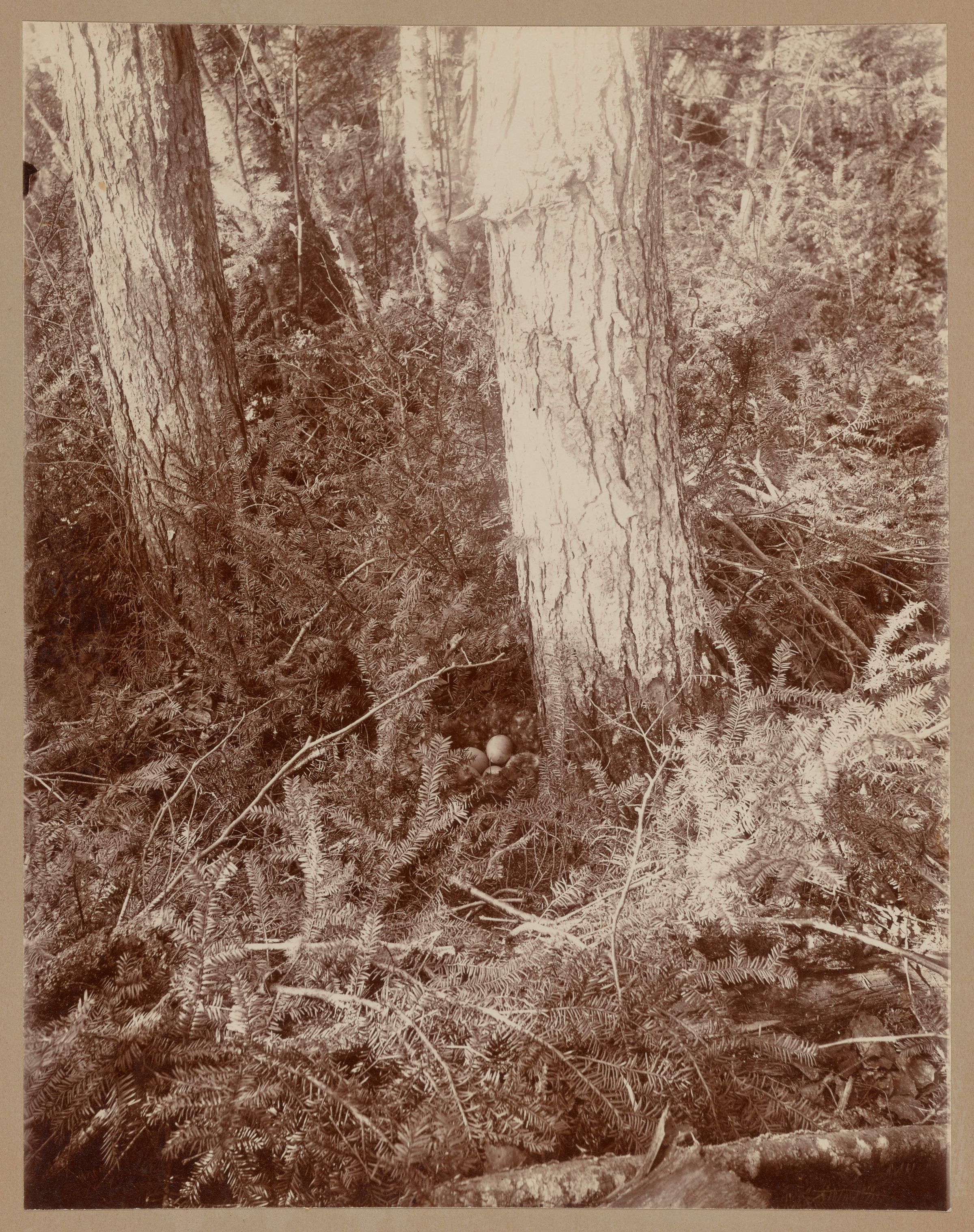 Nest with eggs just below center of image along base of tree trunk. Surrounded with branches and leaves.Made/Created