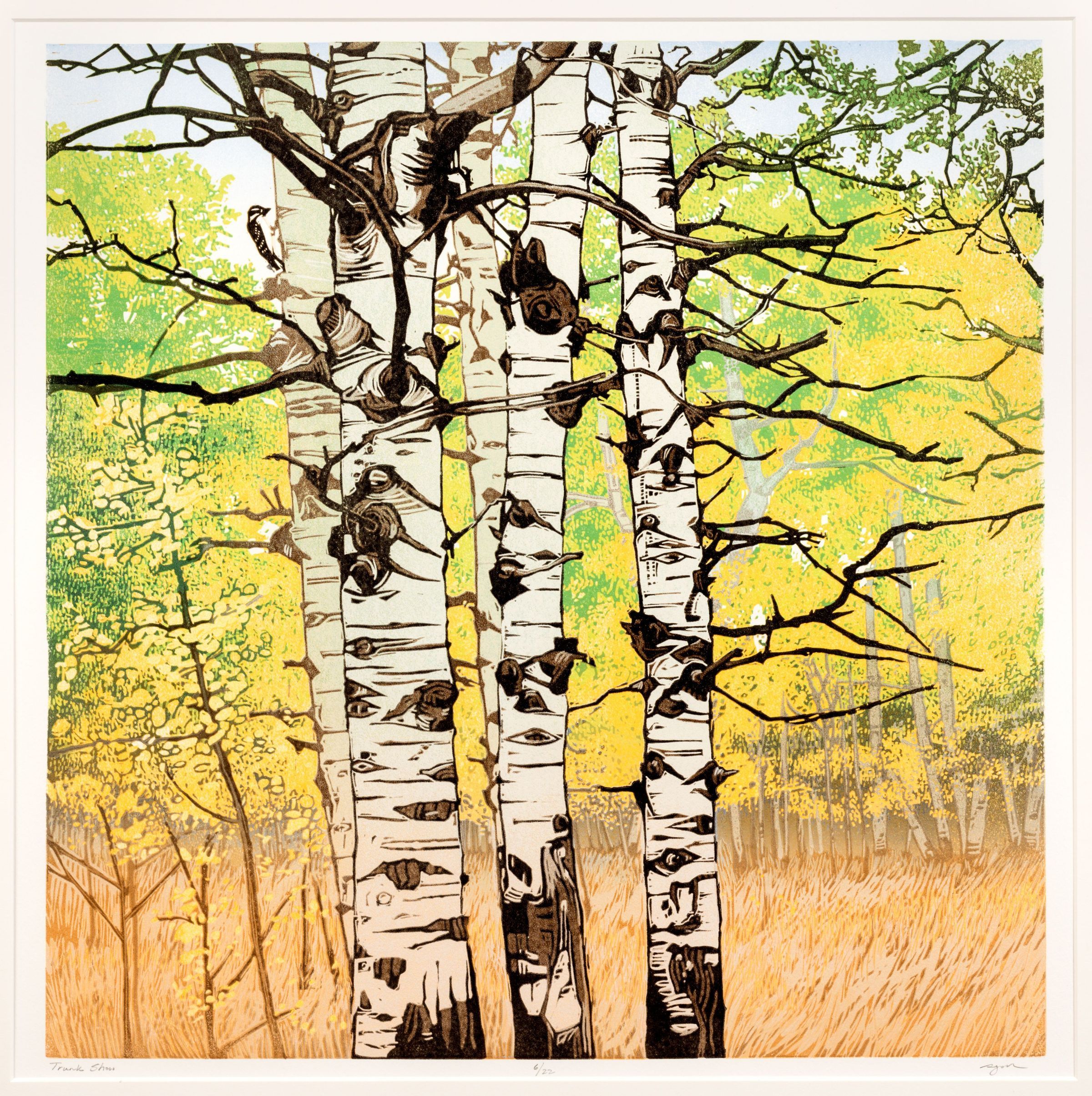 Downy Woodpecker in woodland scene by Sherrie York, reduction linocutArtwork Details