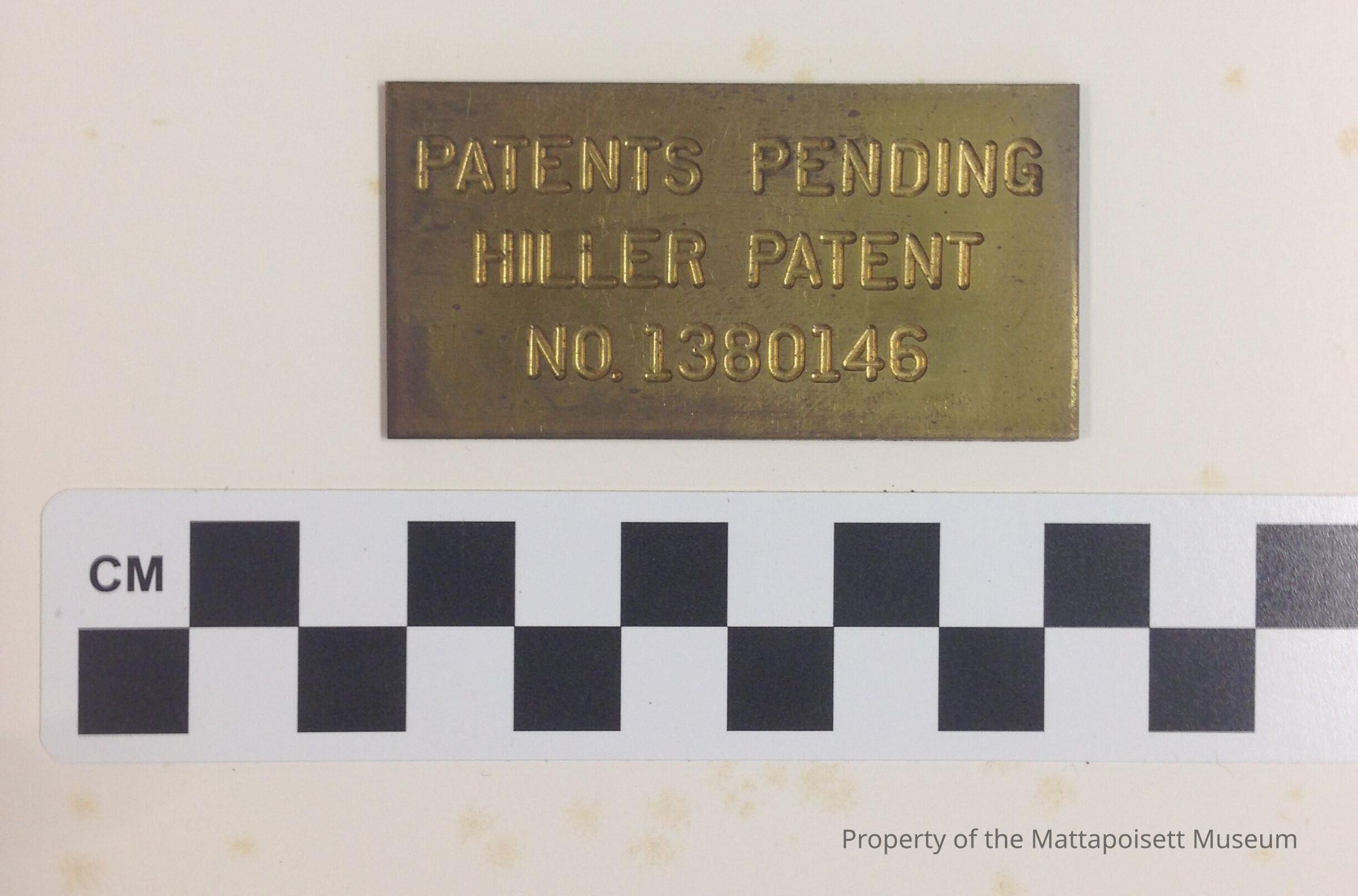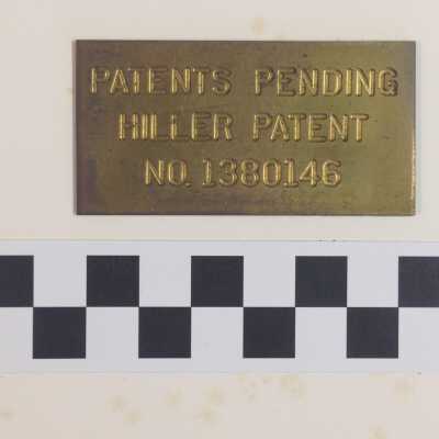 Patents pending plate, gold. Hiller patent No. 1380146Acquisition