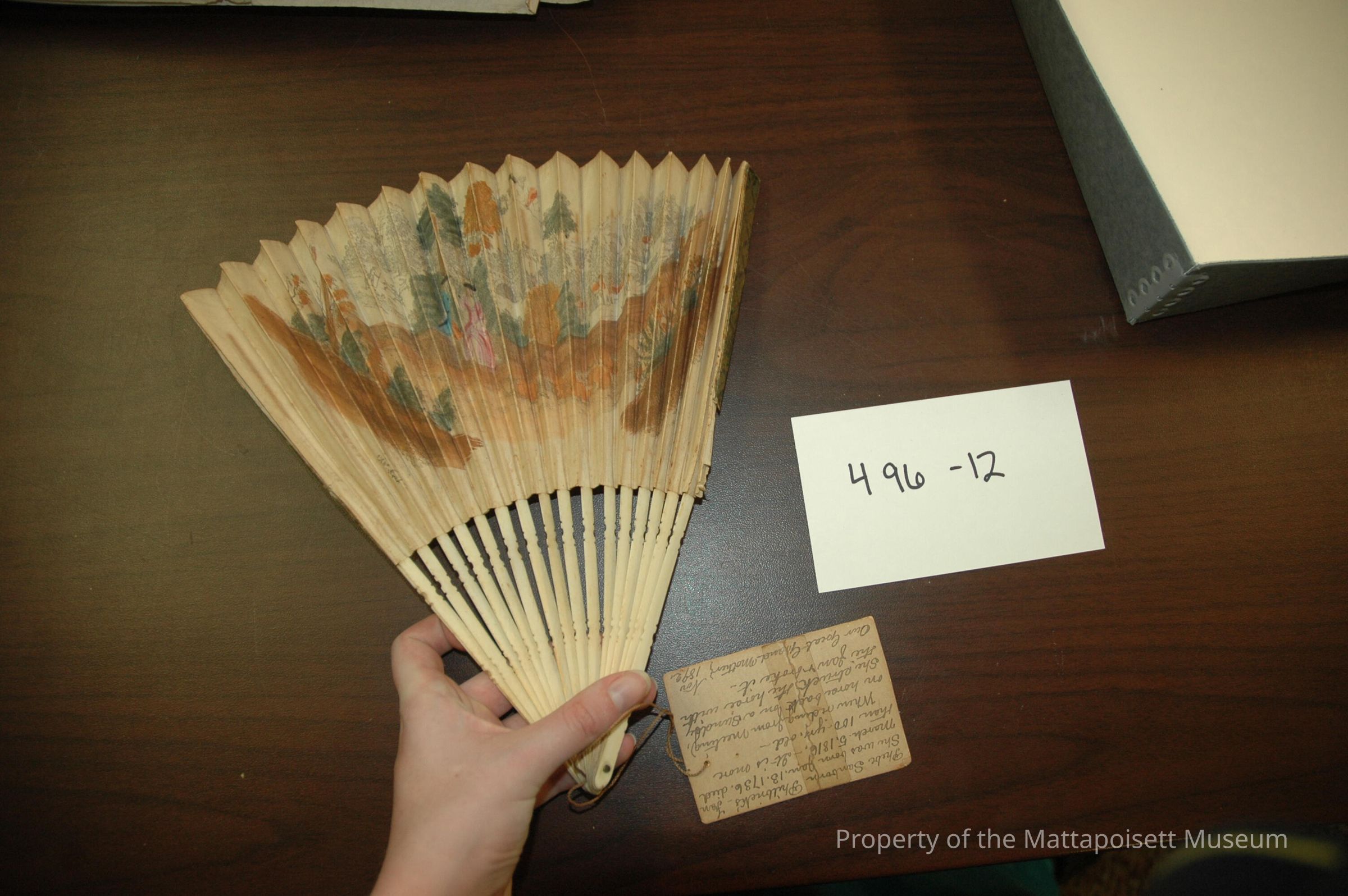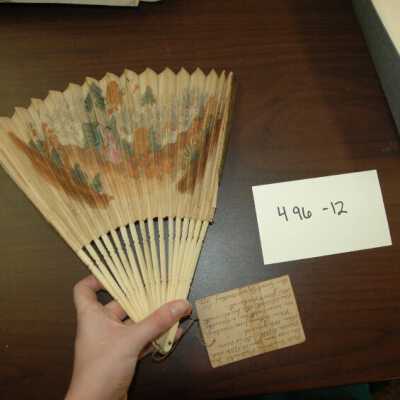 Painted paper fan with ivory handle. Attached tag may have more information.Collection