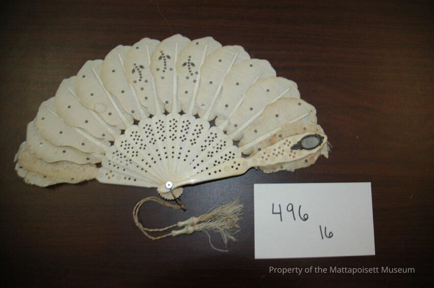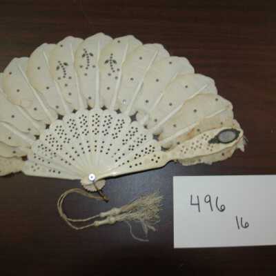 Fan with white silk feather-shaped arms, ivory handle, and decorative silver studs.Collection