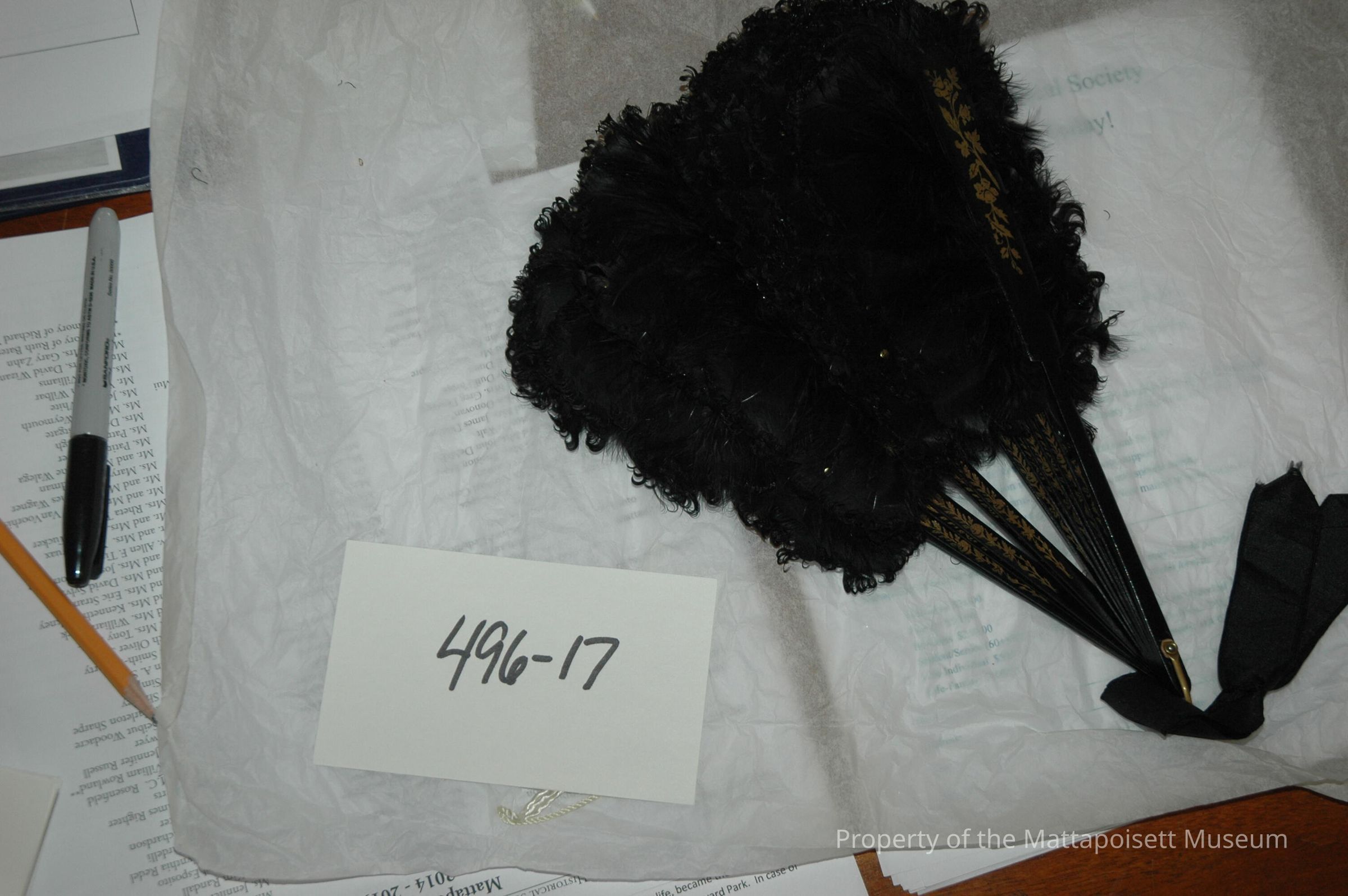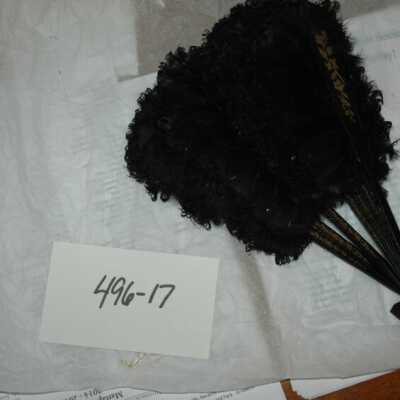 Black feather fan with black wooden handle with gold decoration.Collection