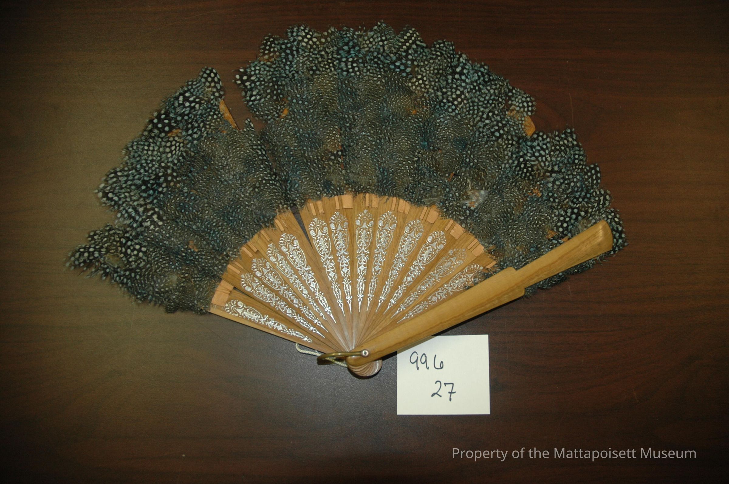 Spotted feather fan, wooden handle with painted or inlaid silver decoration.Collection