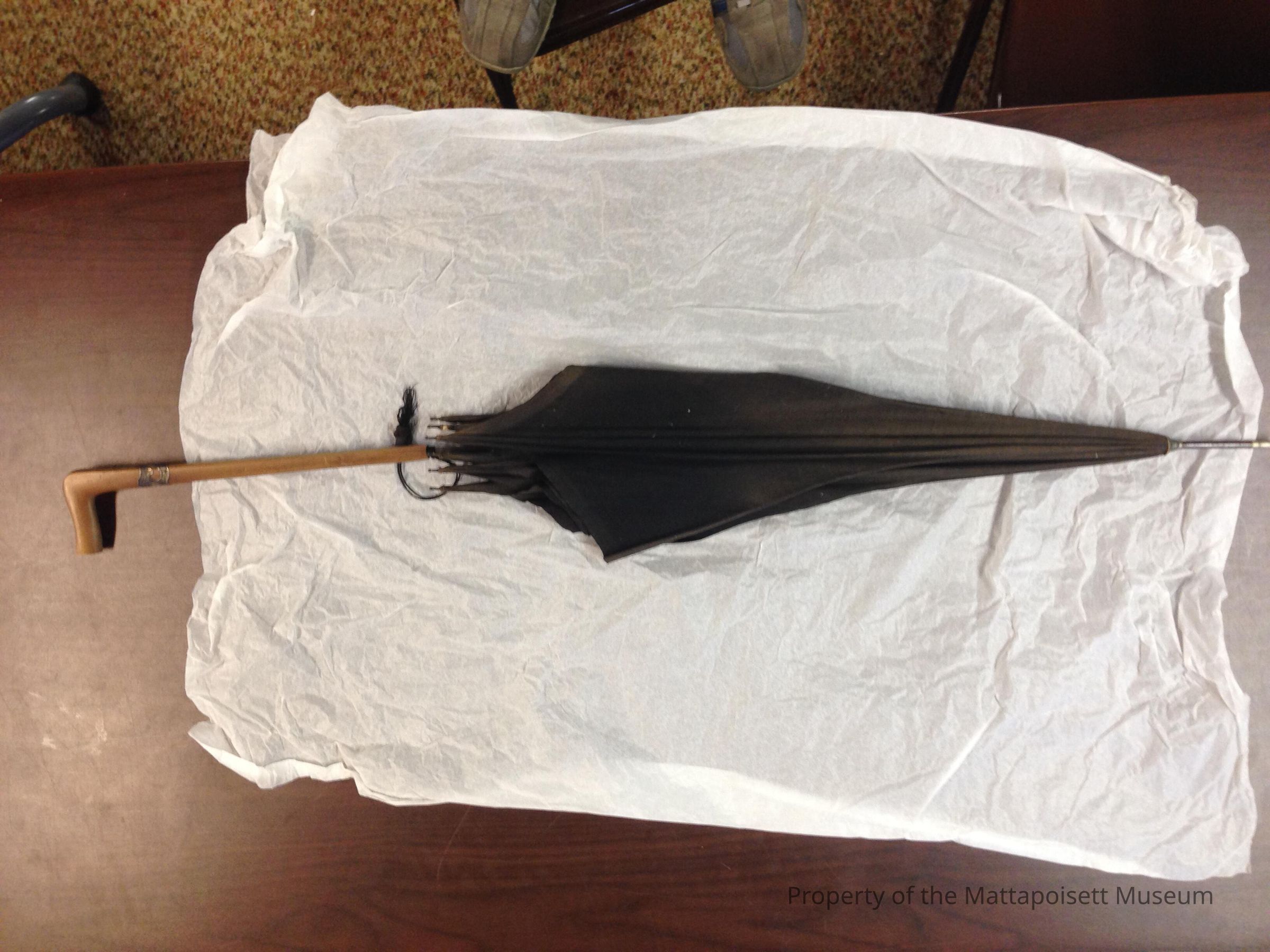 Long, black umbrella with wooden handle. 41 1/2" long with 4" metal tip. Handle is L-shaped with small decorative metal wrap.Collection