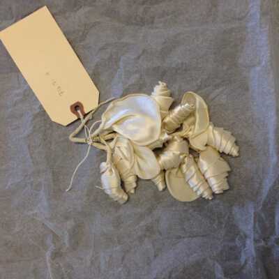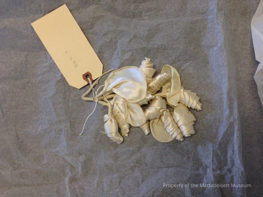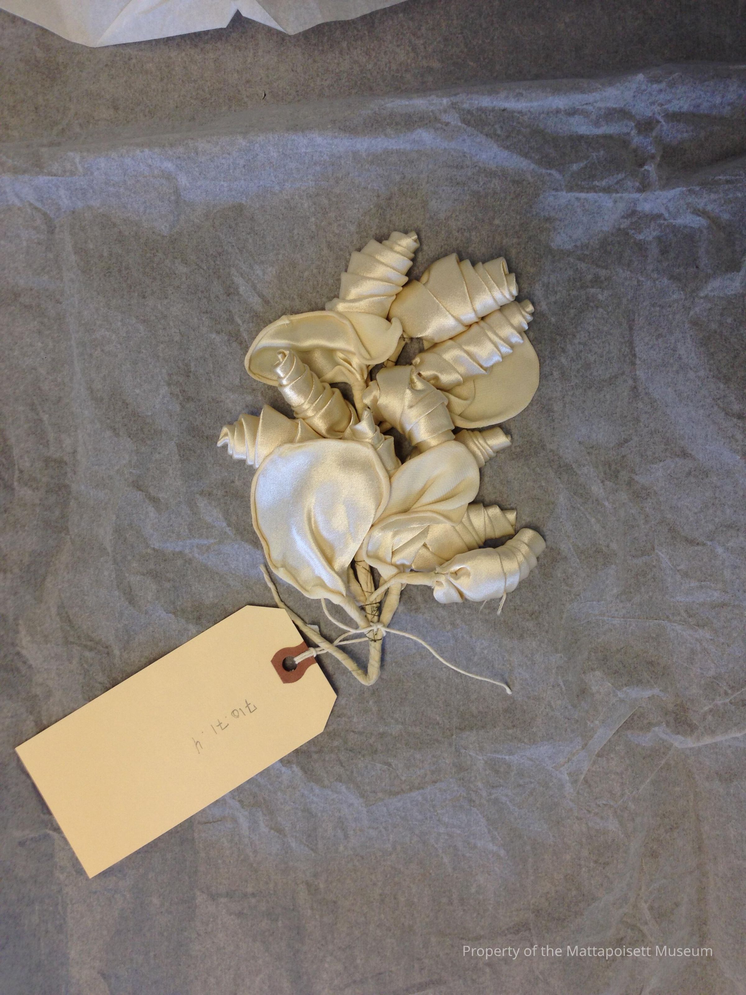 White headpiece. Stylized satin flowers on a wire frame.Collection