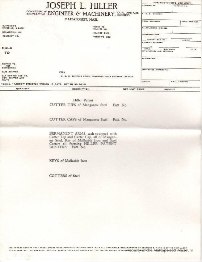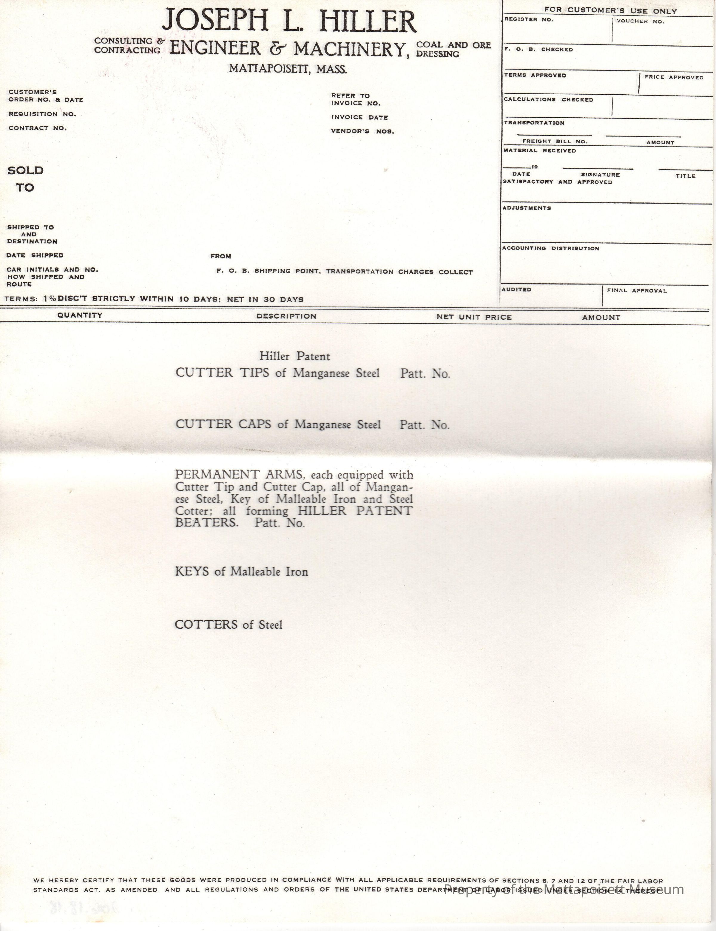 Order forms for Joseph L. Hiller's machinery business. Form has space for customers to fill out the quantities of cutter tips, cutter caps, permanent arms, keys, and cotters. 6 copies, all blank.Acquisition