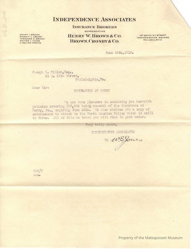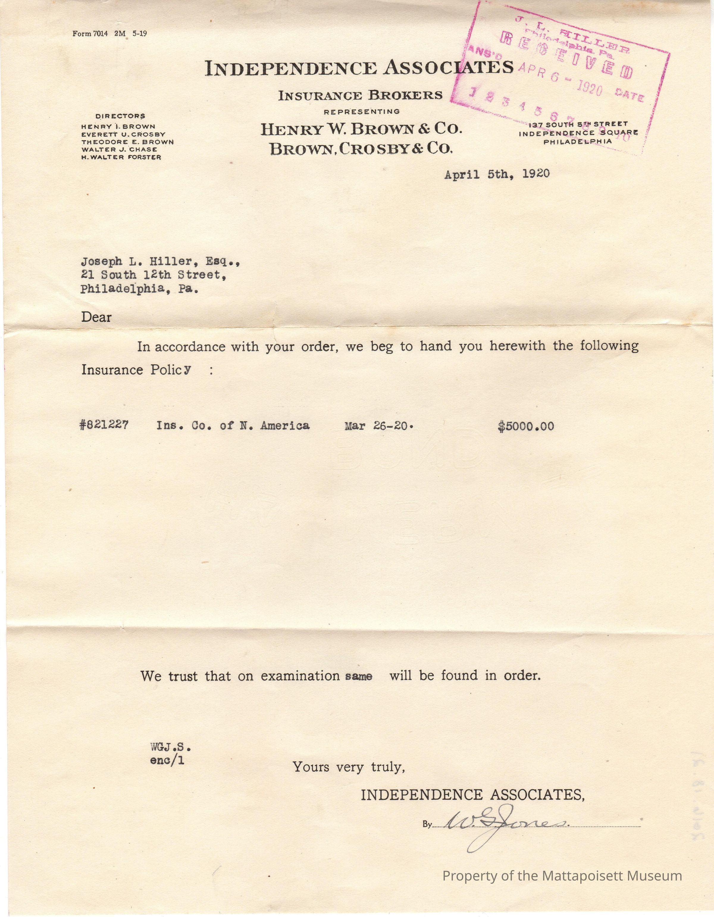 A letter from Independence Associates to Joseph L. Hiller regarding an insurance policy.Acquisition