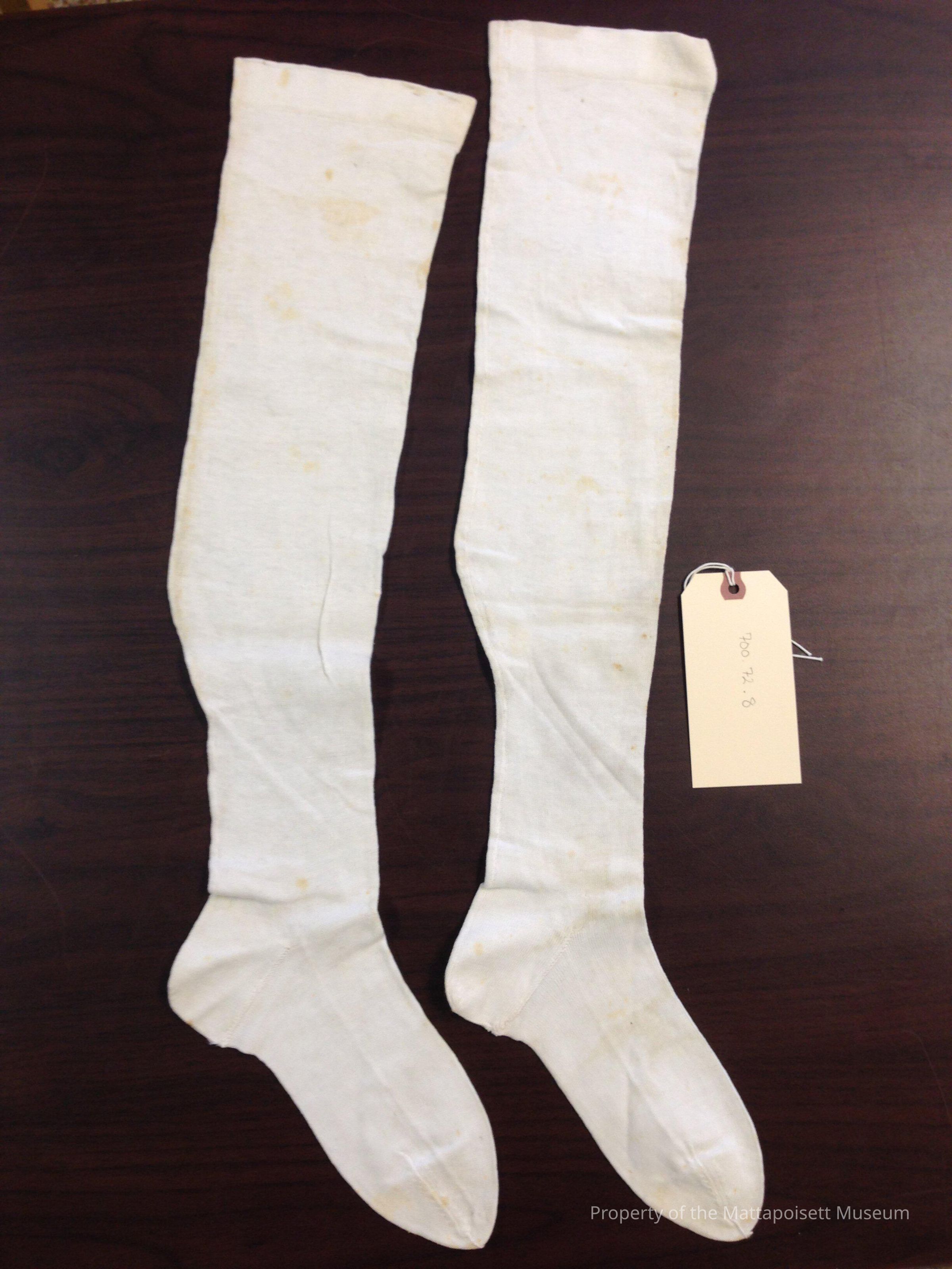 White cotton stockings. One has "Balbriggan London Length" in blue at top, and "Inches 9 Balbriggan" at bottom.Collection