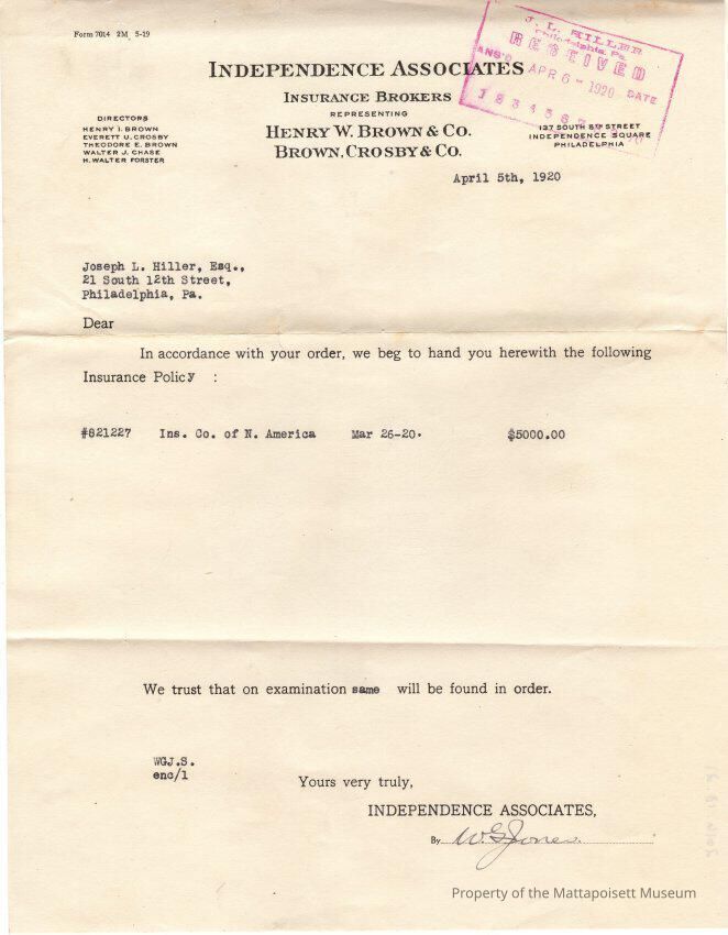 A letter from Independence Associates to Joseph L. Hiller regarding insurance.Acquisition