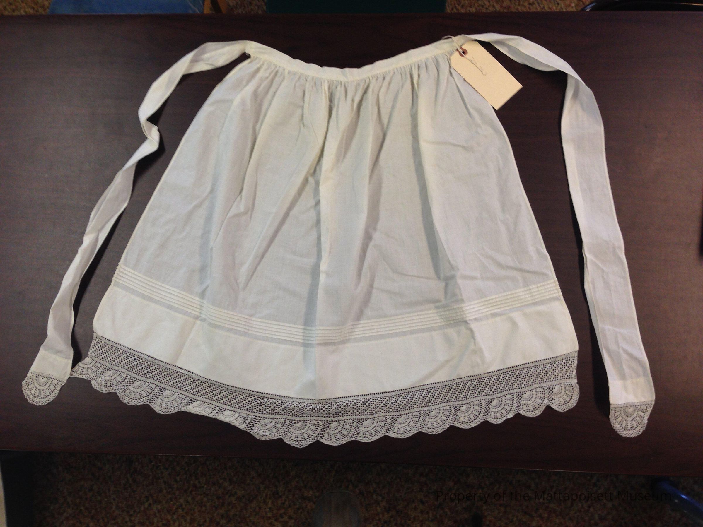 White apron with tatting hem. Has "ITB 1906" on waist.Collection