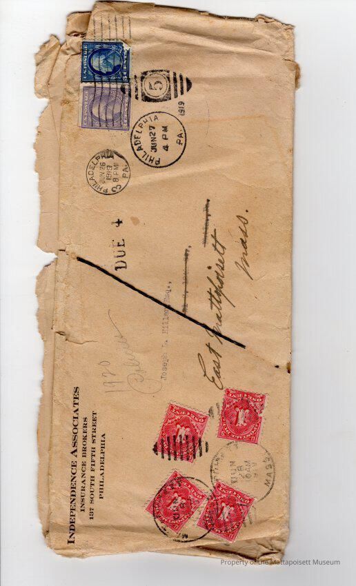 Envelope sent from Independence Associates, Philadelphia to Joseph L. Hiller. A Philadelphia address is printed, but crossed out and "East Mattapoisett, Mass." written in. Includes two postmarks from Philadelphia and two from Mattapoisett, as well as several stamps. Contained insurance documents relating to Hiller's coal cleaning and machinery business (2016.18.20 - 2016.18.23).Acquisition