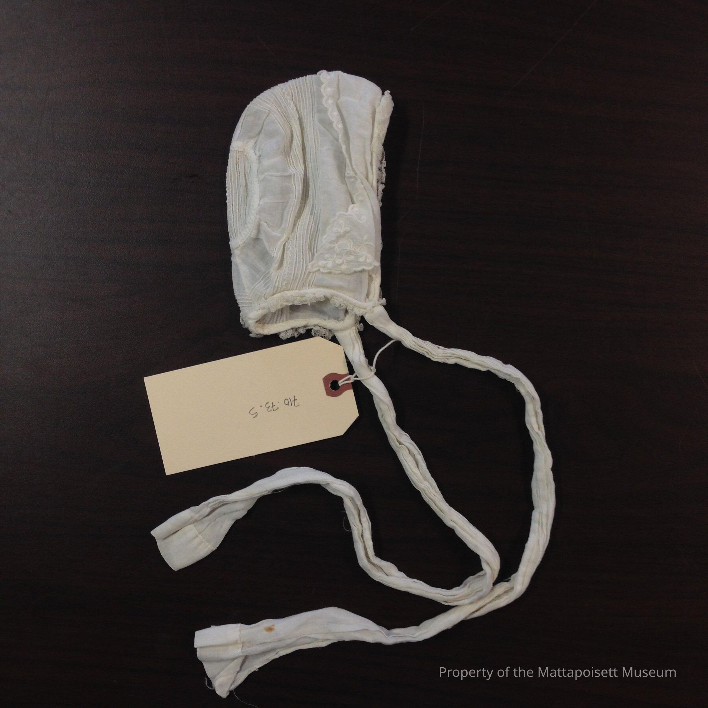 White infant's bonnet with scalloped edge and ties.Collection