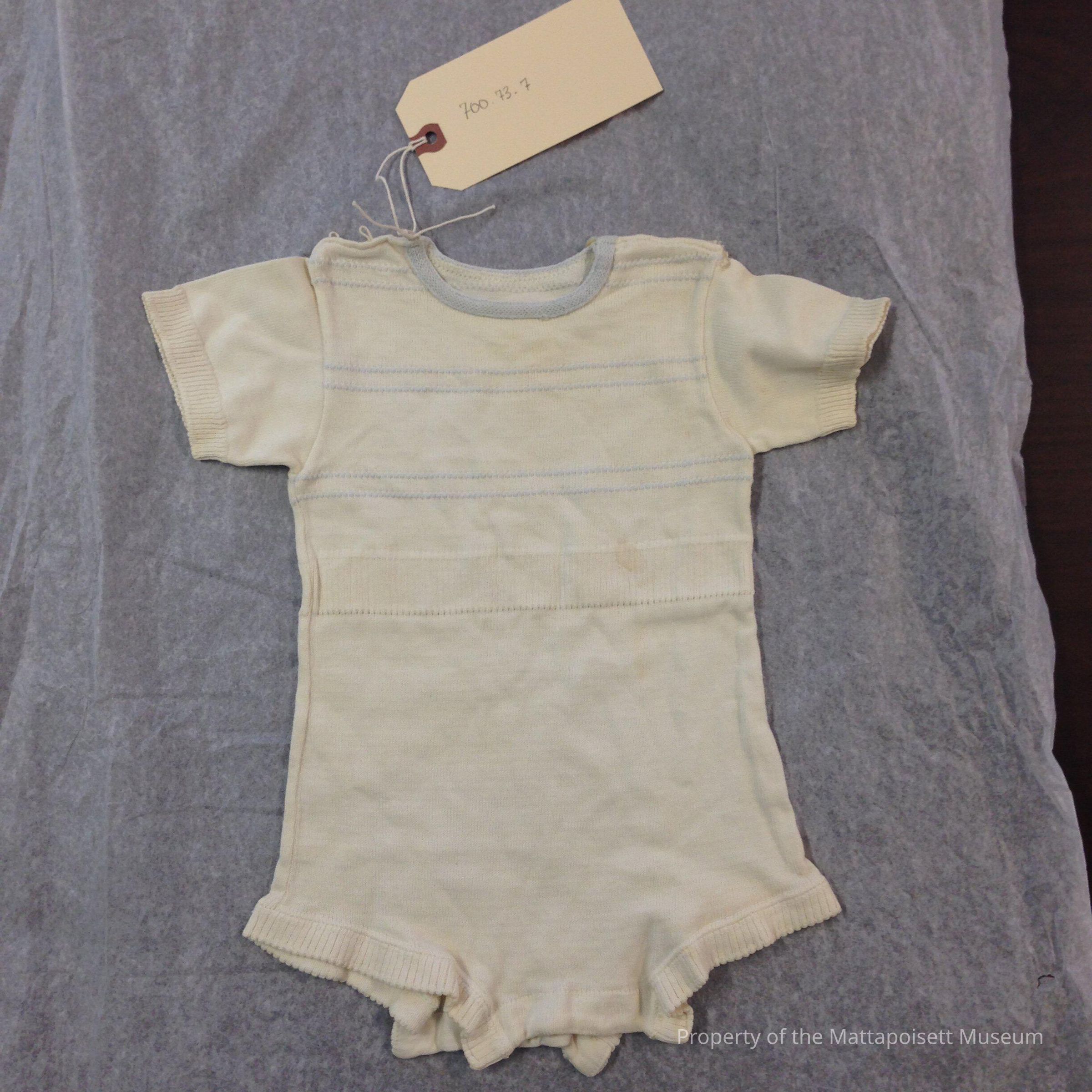 White cotton infant bodysuit, blue collar and horizontal stripes.Collection