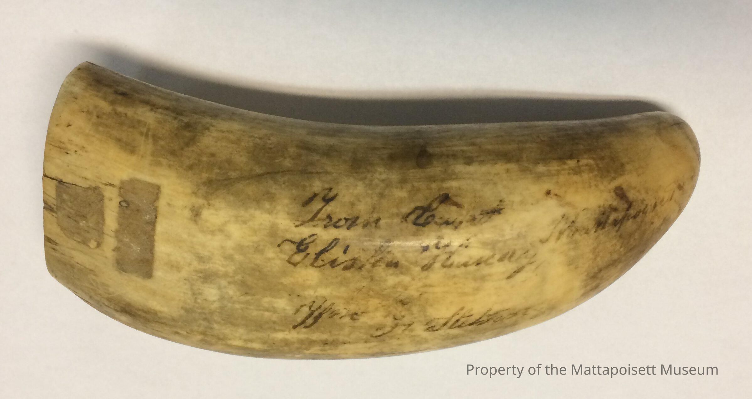 19th century whale's tooth, approx 7" long, inscribed in ink. Full inscription is difficult to decipher: