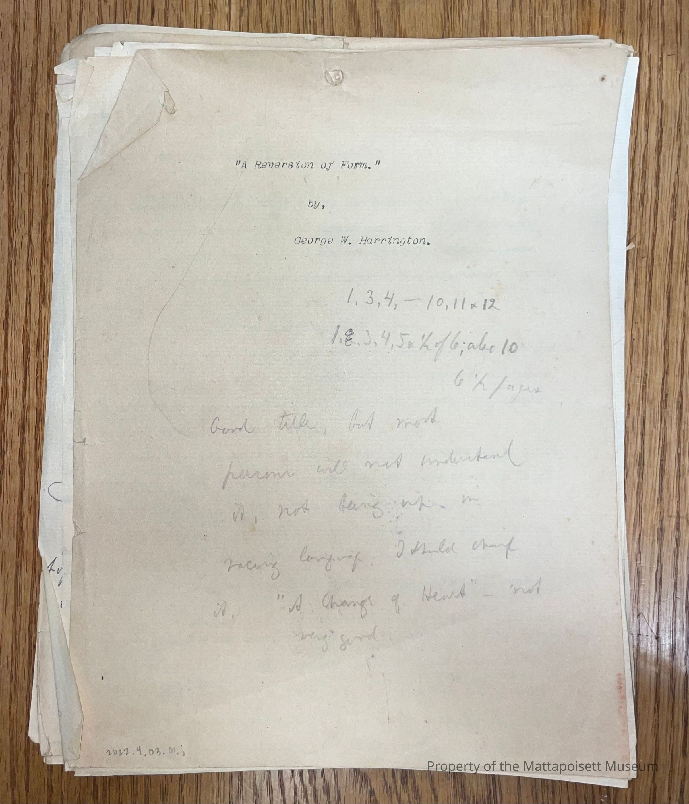 Harrington is a published author who spent his summers writing in Mattapoisett. The first book he published was a short story collection about horses called "A Reversion of Form" in 1911. 2022.4.03 is the manuscript series.