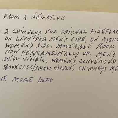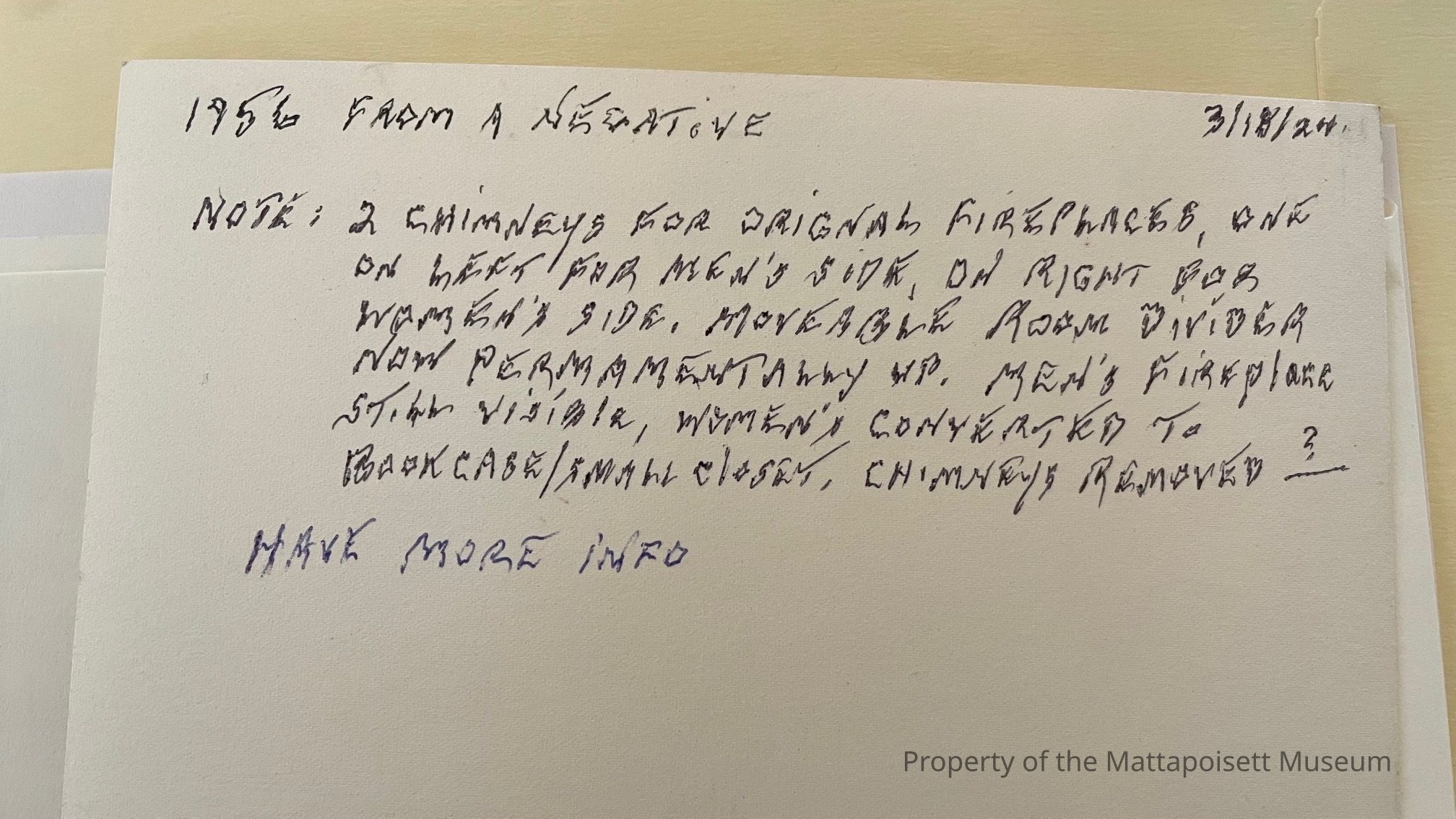 Note on back of photo, written by Brad Hathaway - 3/18/[20]24. 1956 from a negative. Note: 2 chimneys for original fireplaces, one on left for men's side, on right for women's side. Moveable room divider now permanentally up. Men's fireplace still visible, women's converted to book case, small closet, chimneys removed____? Have more info.Created By