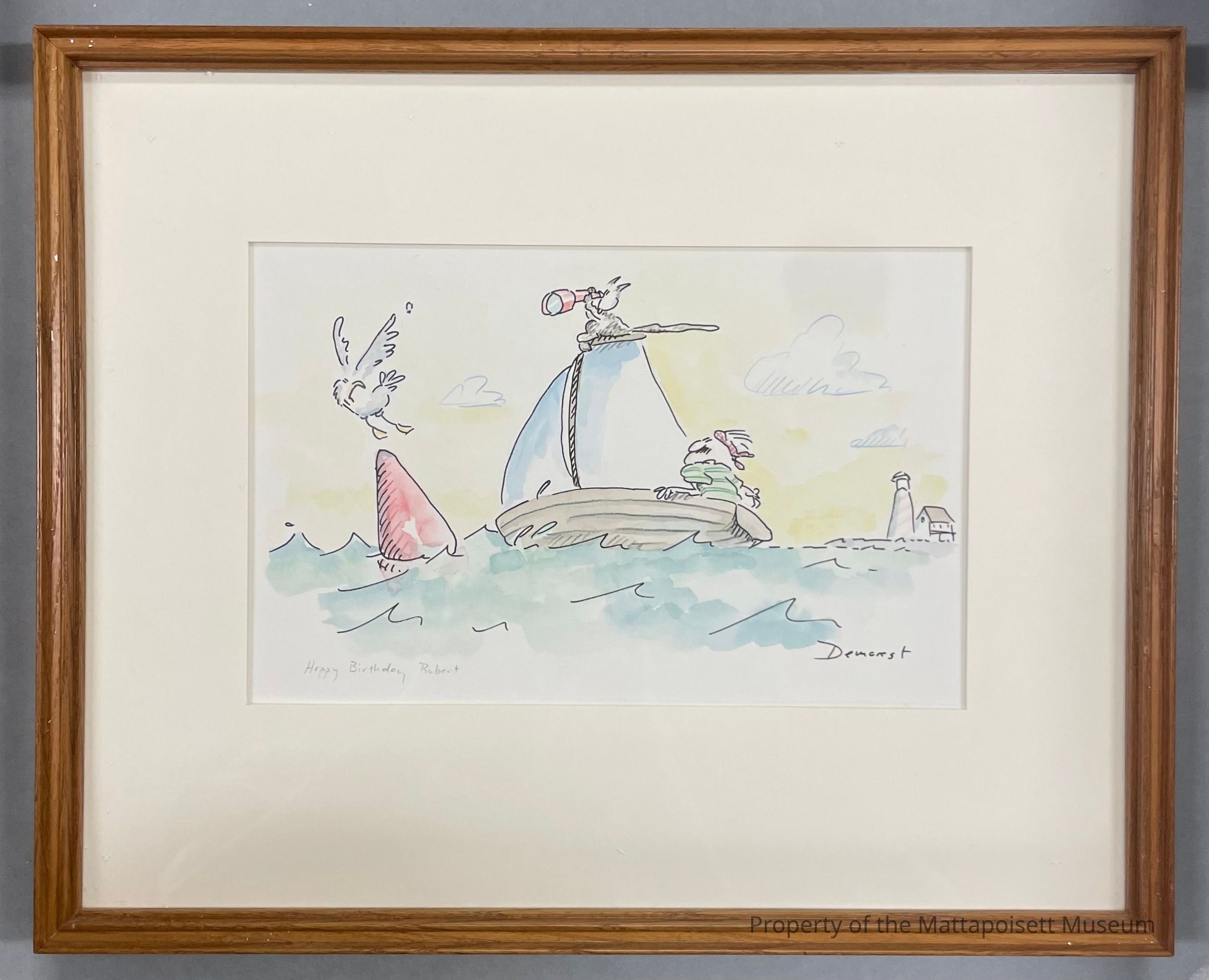 A watercolor and ink painting by Chris Demarest, commissioned by Anne Booth as a birthday present. The painting shows Robert Hauser sailing his Herreshoff 12 1/2 with Ned's Point Lighthouse in the background, with his cat "Jumper" as the lookoutArtwork Details