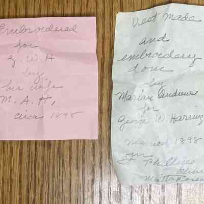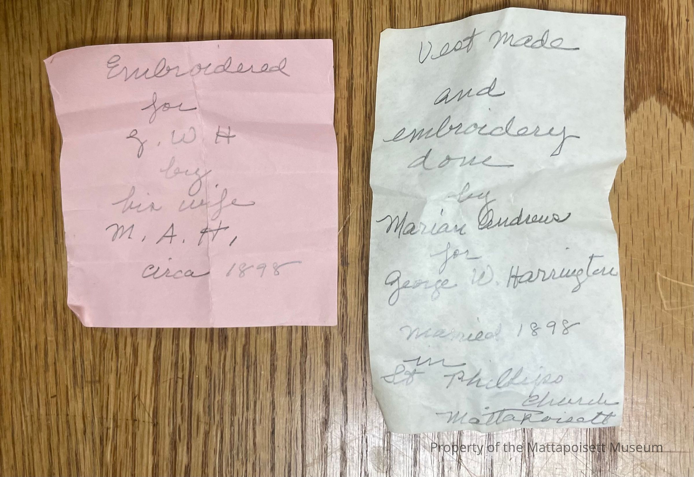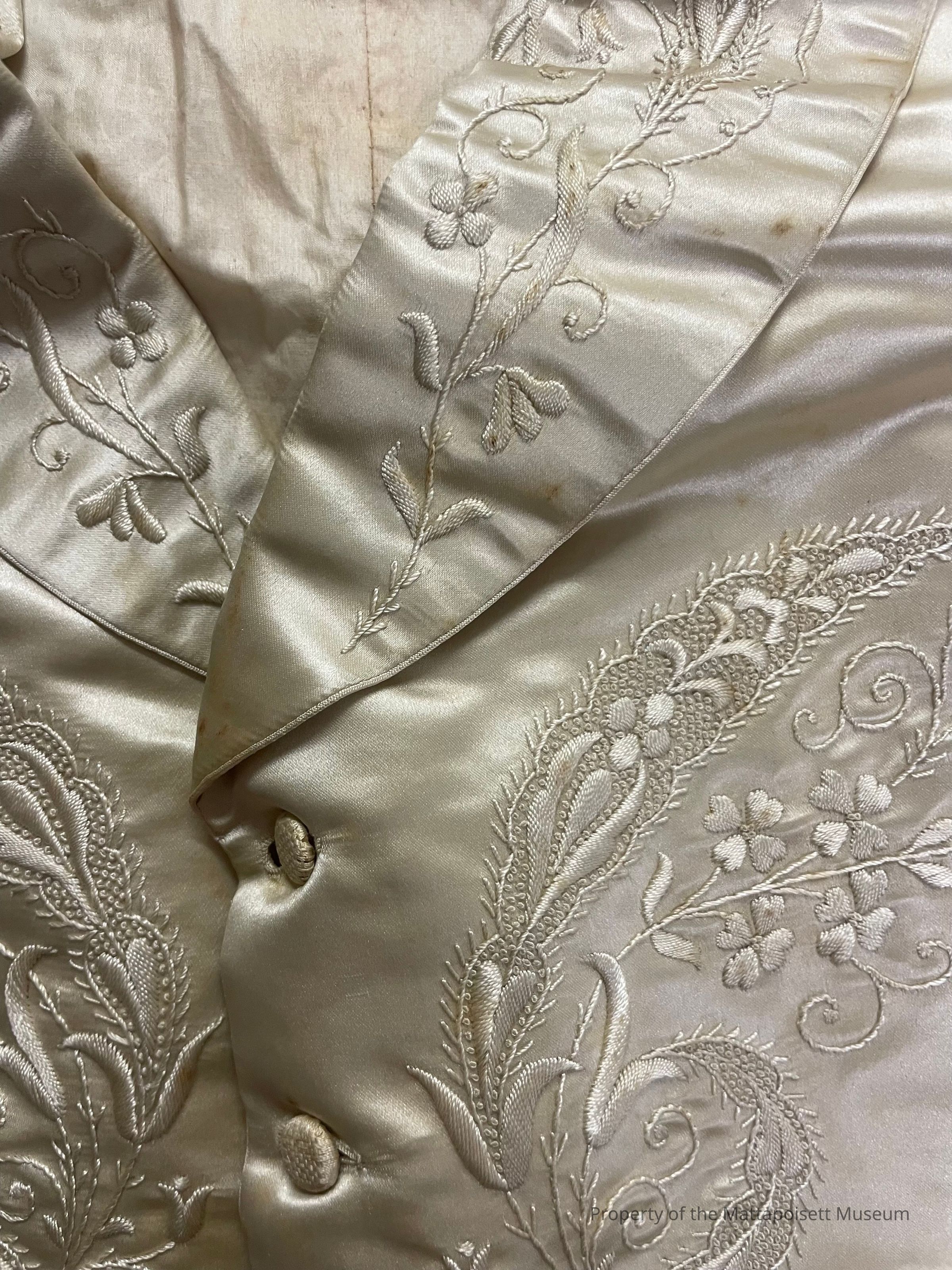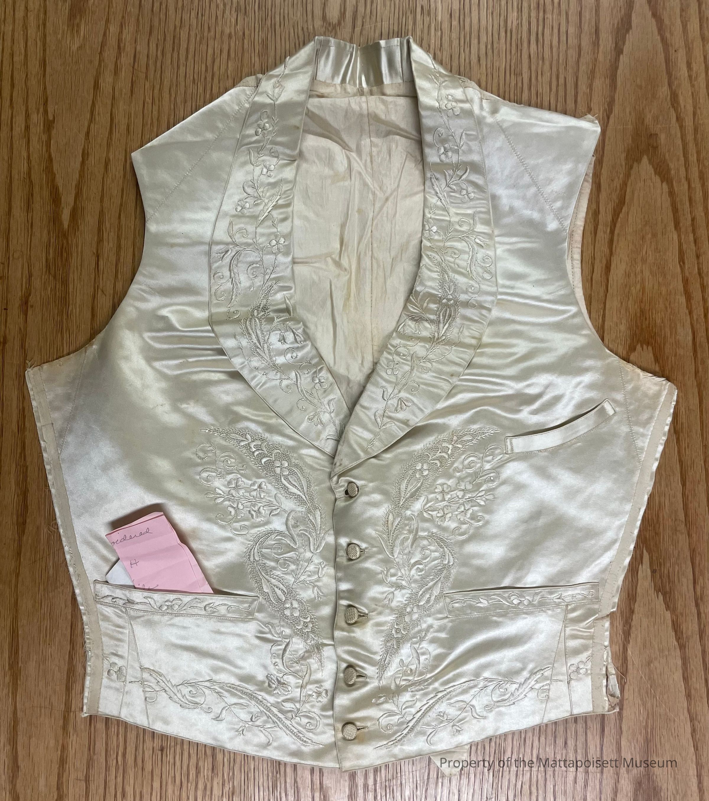 Vest made and embroidery done by Marian Andrews for George W. Harrington. Married 1898 in St. Phillips Church Mattapoisett